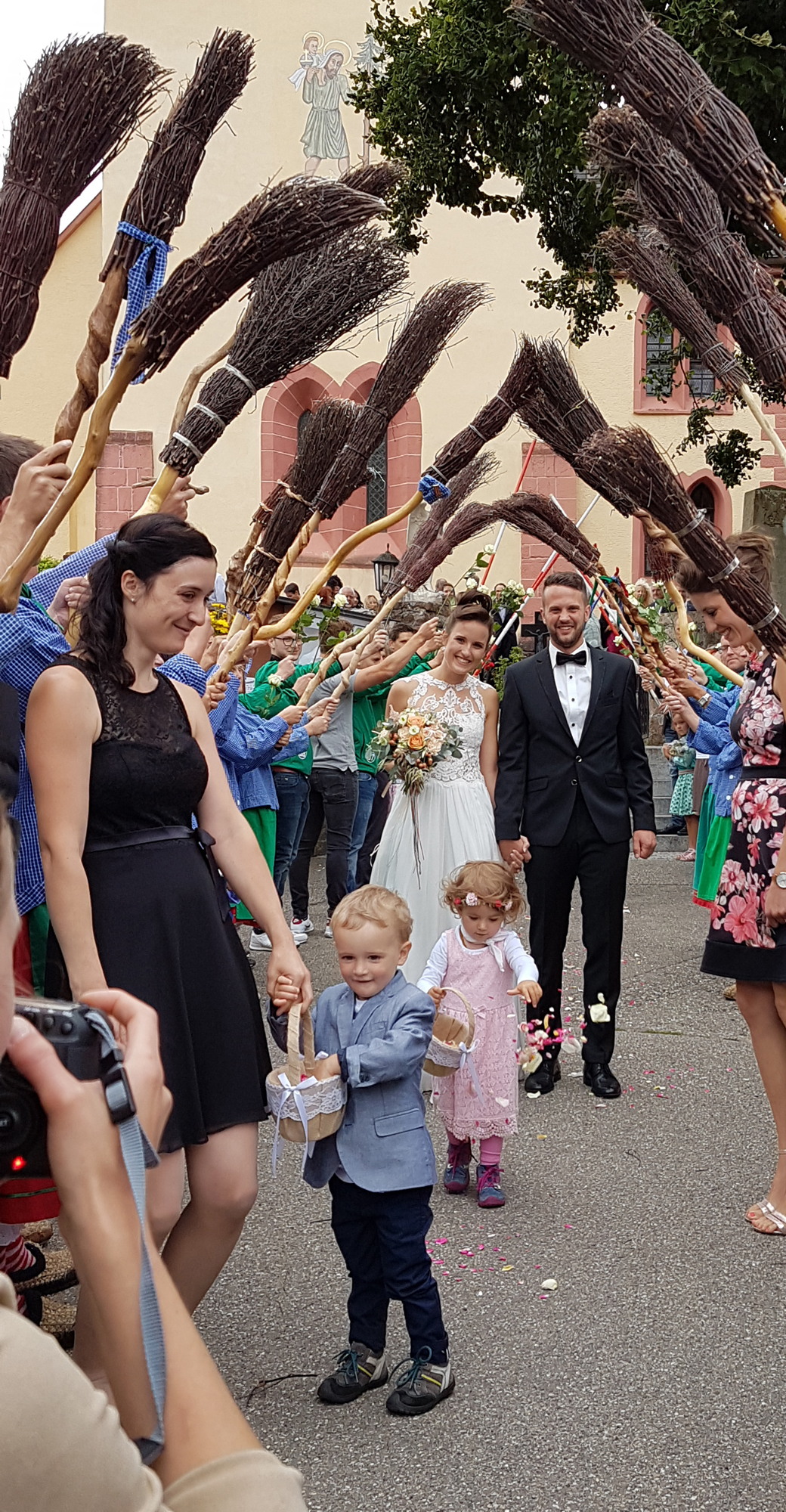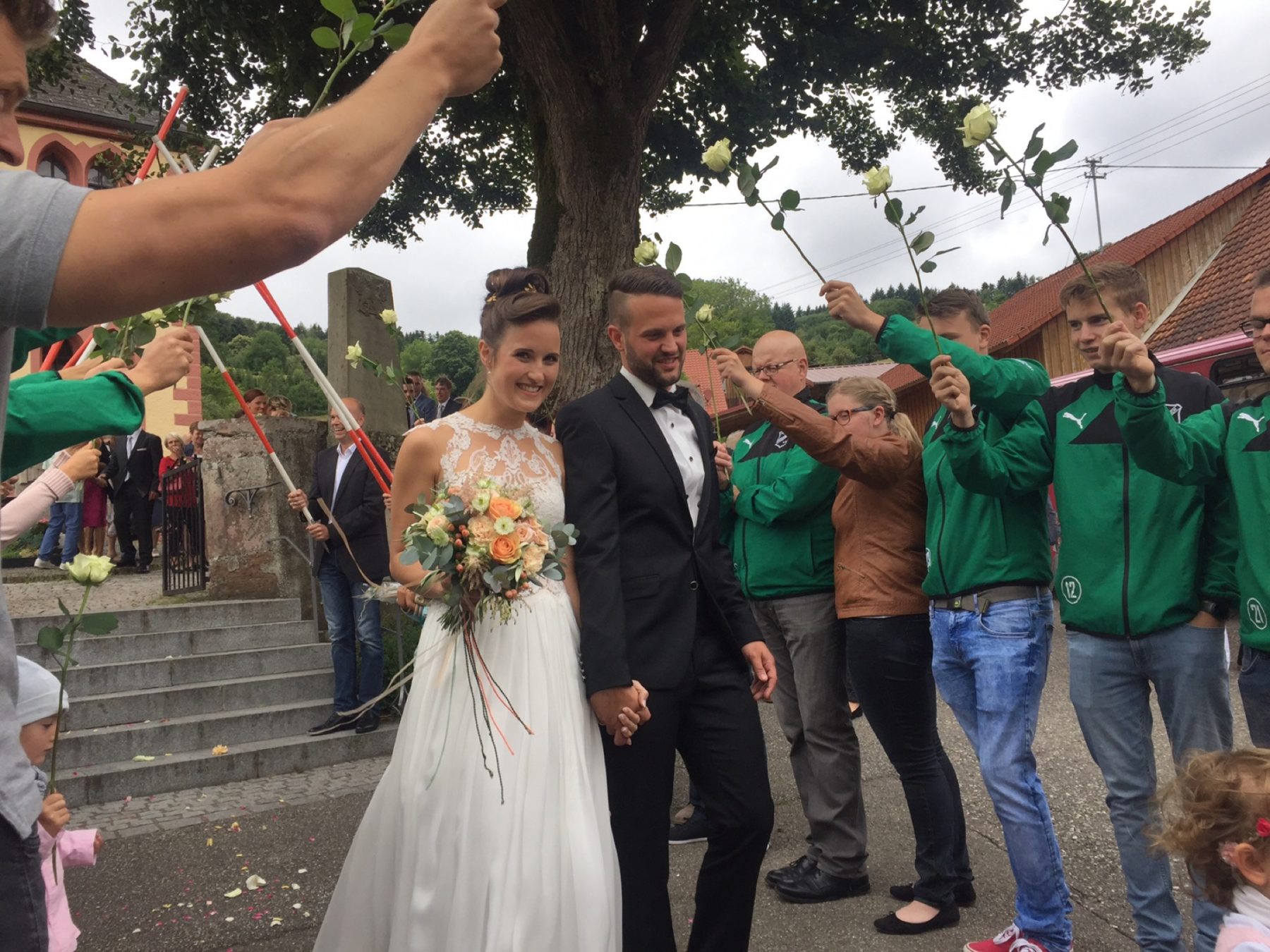 DJK-Vorstand Markus Schäfer überbrachte dem Brautpaar die Glückwünsche des Vereins. Auch die Arbeitskollegen der Braut von den wwg-Architekten Biberach bildeten ein Spalier.