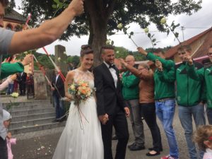 Nach dem Gottesdienst gab es ein großes Hochzeitsspalier. Zahlreich vertreten war die DJK Prinzbach mit Mitgliedern aus der Vorstandschaft und Aktiven der I. und II. Mannschaft. Für sie war es eine Ehrensache, ihrem Vorstandskollegen, Betreuer und Mannschaftskameraden Spalier zu stehen und zu gratulieren. Simon Christ ist seit der Jugend aktiver Spieler der DJK Prinzbach und seit einigen Jahren als Spielausschuss in der Vorstandschaft tätig.