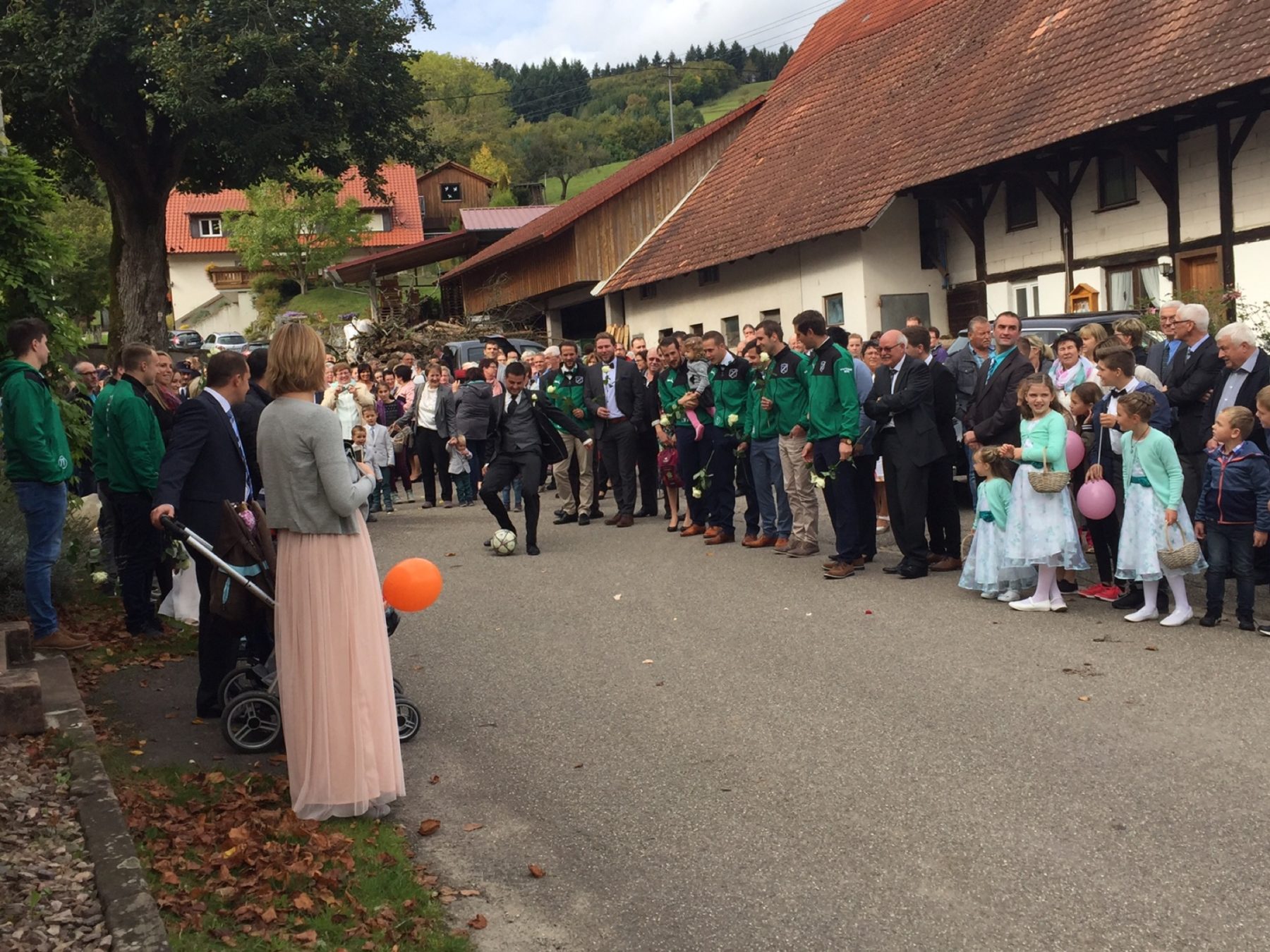 Den Anfang im Reigen der Spaliersteher bildete die Fasentgemeinschaft »Die lustigen Prinzbacher Wagenbauer« und die Narrenzunft der Bergwerksgeister, welcher die Brautleute angehören. Danach durfte das Brautpaar das Schlauchspalier der Freiwilligen Feuerwehr Abt. Prinzbach durchschreiten. Anschließend war Teamwork angesagt, um mit einer Wasserspritze gemeinsam einen kleines Feuer zu löschen. Zahlreich vertreten war die DJK Prinzbach mit Mitgliedern aus der Vorstandschaft und Aktiven der ersten und zweiten Mannschaft – eine Ehrensache ihrem Vorstandskollegen und Mannschaftskameraden Spalier zu stehen und zu gratulieren. Frank Becherer bringt seit Jahren sein Wissen und Können mit viel Einsatz im Bauausschuss der DJK Prinzbach ein und ist seit Jahren aktiver Spieler der ersten Mannschaft. Die DJK-Vorstände Markus Schäfer und Ernst Eble überbrachten dem Brautpaar die Glückwünsche und Geschenke des Vereins. Zum Sektempfang traf man sich im Pfarrhof.