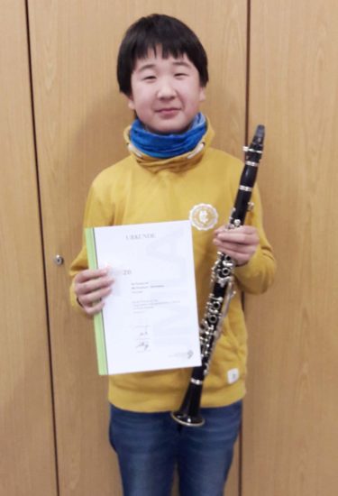 Jungmusiker Ho Young Lee hat vor einigen Wochen an der Klarinette sein bronzenes Leistungsabzeichen absolviert und darf ab Januar im großen Orchester mitspielen. Am vergangenen Donnerstag erhielt er seine Urkunde sowie die Nadel. Das lange Üben vom praktischen und theoretischen Teil hat sich somit gelohnt.