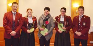 Timo Schmider (an der Trompete) wurde auch für 10-jährige Vereinszugehörigkeit geehrt. Aufgrund ihres Ausscheidens ehrte Bernd Schmieder zudem die langjährig aktiven Verwaltungsmitglieder Lisa Gutmann, Bianca Wieland und Sonja Himmelsbach.