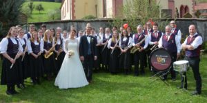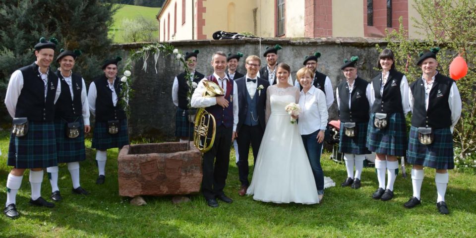 Musikalisch umrahmt wurde die Hochzeitsfeier vom Musikverein Prinzbach-Schönberg unter der Leitung von Dirigent Stefan Griesbaum. Das Musikstück »Highland Cathedral« im Zusammenspiel mit den Prinzbach-Highlanders nach der Trauzeremonie wurde zu einem besonders emotionalen Höhepunkt der Hochzeitsfeier. Auch die beiden Saxophonsolos von Florian Berger im Zusammenspiel mit Katharina Obergföll am E-Piano und dem Prinzbacher Orchester boten besonderen Hörgenuss. Zum Ausklang beschenkten der Musikverein Prinzbach das Brautpaar mit dem schwungvollen »Concerto d’amore«. Organist und Patenonkel Reinhold Studer rundete die konzertante Hochzeitsfeier ab.
