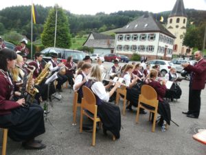 Nach dem eucharistischen Segen zogen die Kirchenbesucher auf den Schulhof um den Klängen des Musikvereins zu lauschen. Mit netten Gesprächen beim Mittagessen und bei Kuchen und Kaffee wurde das Fest abgerundet.