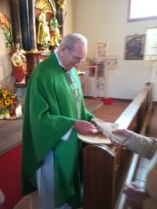 Pfarrer Haas verteilte zum Erntedank Brot an die Gottesdienstbesucher