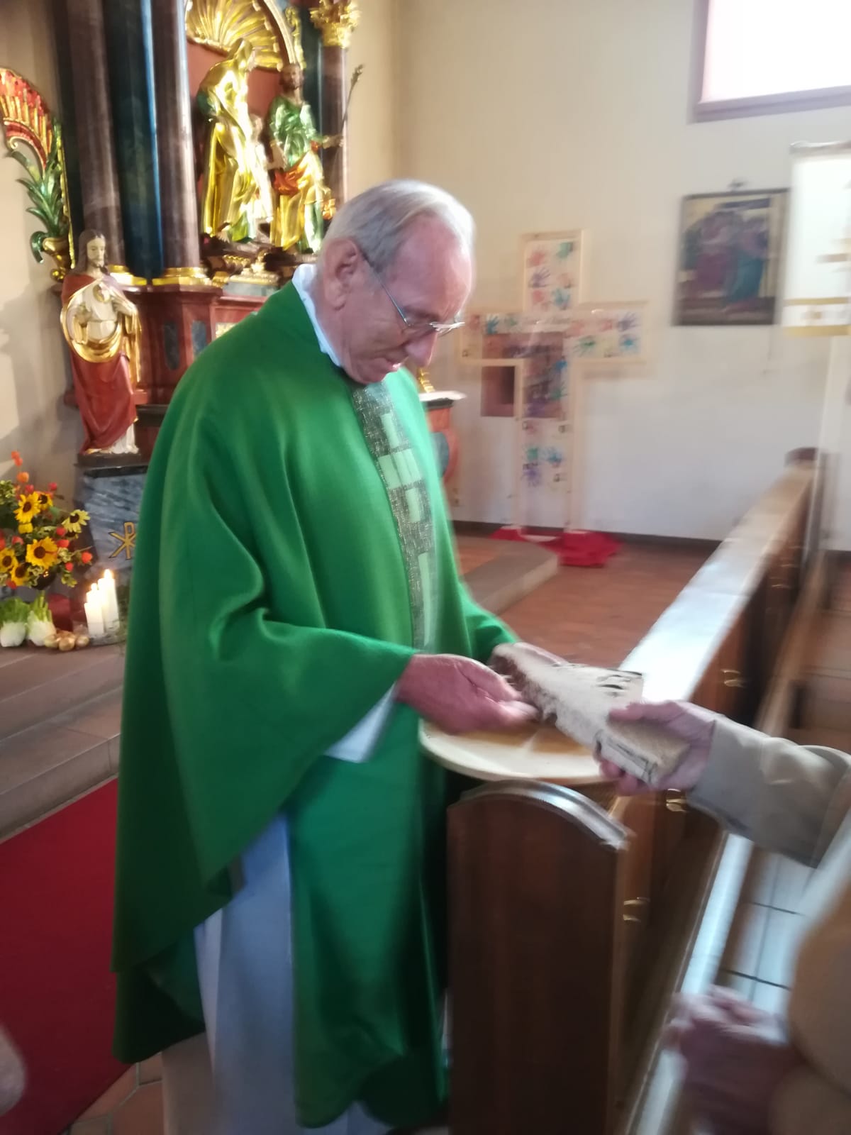 Eine besonders schöne Ges­te in der Erntedankfeier war das Verteilen von Brot an die Gottesdienstbesucher. Pfarrer Alfred Haas hatte es persönlich in die Mauritius-Kirche nach Prinzbach mitgebracht