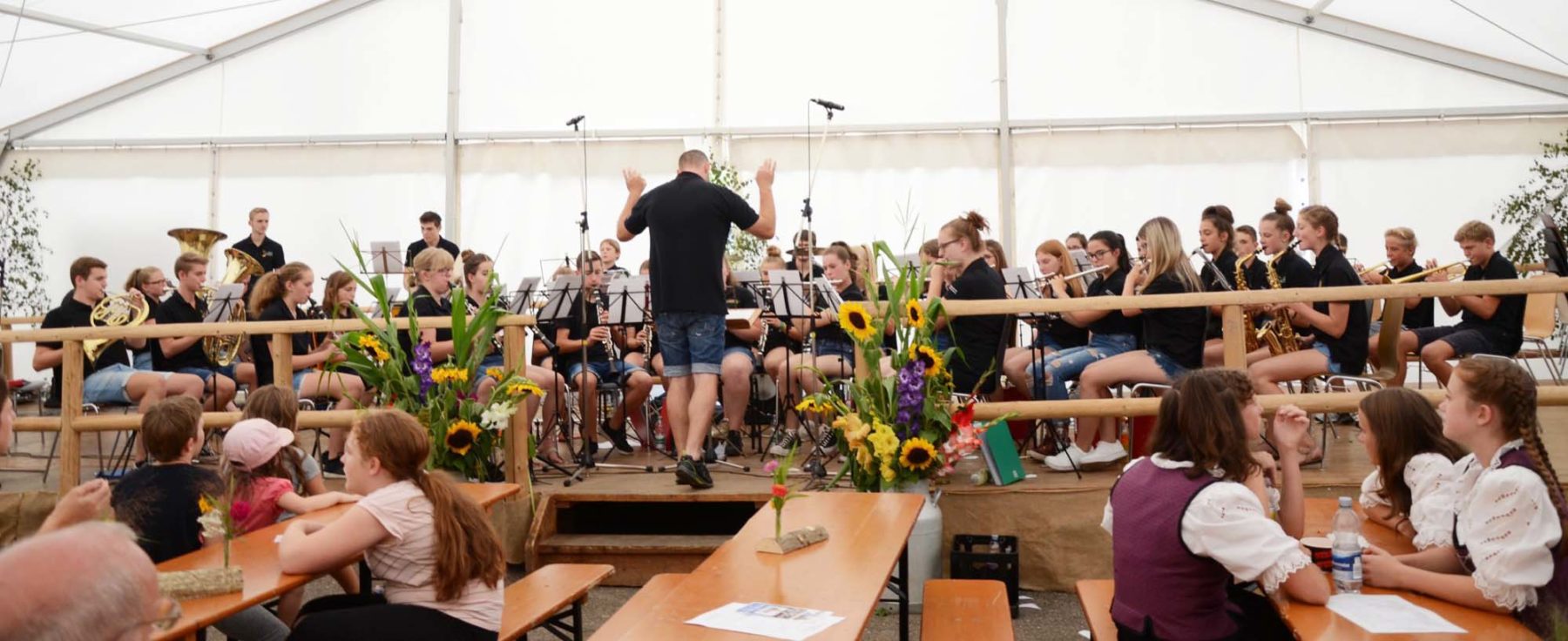 Das Jugendorchester Prinzbach-Steinach unter der Leitung von Gast-Dirigent Stefan Griesbaum überzeugte anschließend mit neuen Pop-Songs und spannenden Filmtiteln. Besonders der Titelsong von der populären US-Fernsehserie »Game of Thrones« sorgte für Spannung im Festzelt. Mit fast 40 anwesenden Jungmusikern und Jungmusikerinnen zeigte das Jugendorchester nicht nur ihr Talent, sondern auch was für eine starke Gruppe sie sind. Trotz stürmischen Wetters lieferte ihr Konzert tolle Klänge und die jungen Musiker wurden zu Recht mit einem lauten Beifall mit der Einforderung von zwei Zugaben bedankt.