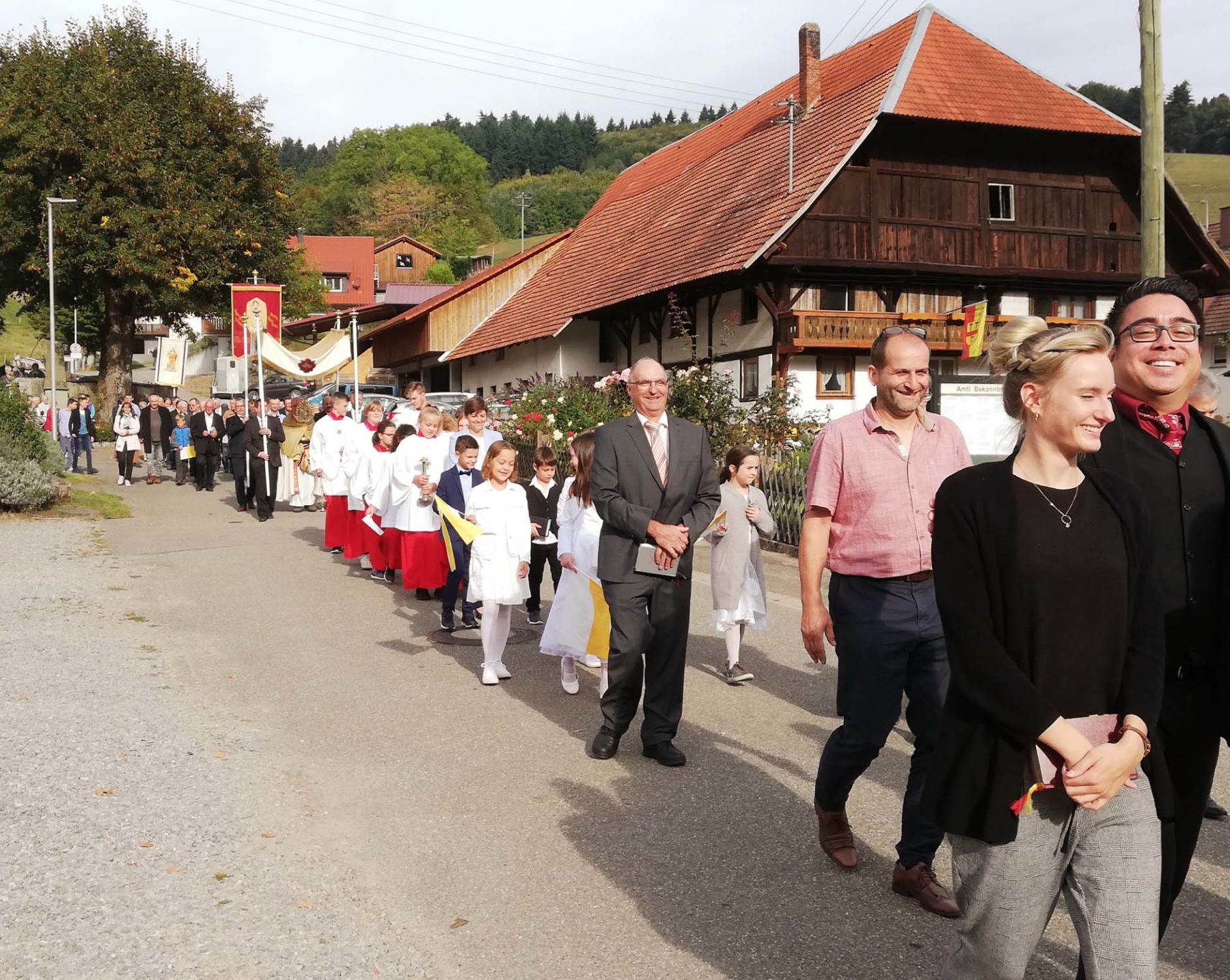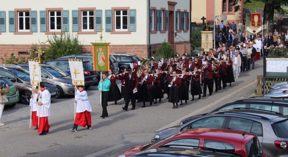 Nach dem Gottesdienst zogen die Gläubigen in einer Prozession in Begleitung der Musik- und Trachtenkapelle Prinzbach-Schönberg e. V. Aus, um das Allerheiligste hinauszutragen.