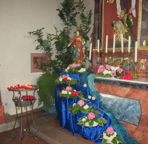 Dort entstand am linken Seitenaltar, dem Altar der schmerzhaften Muttergottes, ein Mai-Altar. Mit einer zusätzlichen Marienstatue, Kerzen und Blumenschmuck wurde von Messnerin Rosa Obergföll die Gestaltung übernommen. Er lädt zum Verweilen, zur Anbetung oder auch zum Gesang ein. In den Bänken liegen verschiedene Texte für persönliche Maiandachten in der Kirche oder für zuhause aus. Auch verschiedene Liedvorschläge wie, Meerstern, ich dich grüße, Maria, dich lieben oder Segne du Maria, sind in den Andachten mit aufgeführt. Der Mai-Altar lädt täglich den ganzen Monat über zum Verweilen oder auch zum Kerzen entzünden ein. Auch die Osterdekoration am Zelebrationsaltar lädt zur Anbetung und zum Gedenken mit ein.