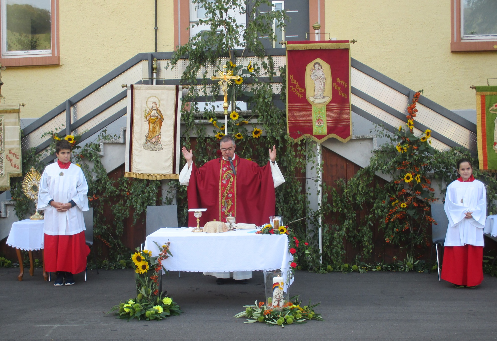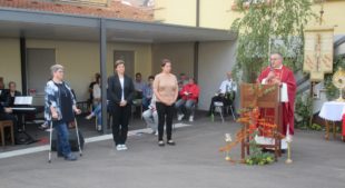 Seelsorgeleiter und Pfarrer Bonaventura Gerner zelebrierte den feierlichen Festgottesdienst. Das Organisationsteam um Gemeindereferentin Anke Haas, Nicole Fronteiner vom Gemeindeteam und Mesnerin Rosa Obergföll hatte den Gottesdienst vorbereitet und zusammen mit einigen freiwilligen Helfern den Schulhof eigens für den Festgottesdienst feierlich geschmückt und hergerichtet.