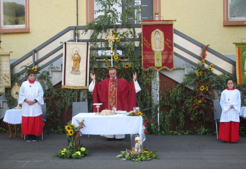 Der Fronleichnamsgottesdienst musste noch aufgrund des schlechten Wetters abgesagt werden. In der Lesung, vorgetragen von Klaus Beck, man würde es heute neudeutsch als Smalltalk bezeichnen, ging es um eine Aussage von Paulus: »Für mich ist Christus das Leben«. Im Matthäus-Evangelium wurde das Himmelreich mit dem Besitzer eines Weinberges verglichen, der viele Helfer benötigt und alle gleichstellt. In der Festpredigt ging Pfarrer Gerner nochmals darauf ein, ob mitten im Leben mit Glück, einem guten Schulabschluss, einem guten Job bis hin zum Abschluss vielleicht dann immer noch Wünsche offen bleiben. Wenn man dann zur Ruhe kommt, stelle sich oft die Frage: Wo ist Christus, hat er uns begleitet oder sogar durch all diese Dinge geleitet? Wir sehen in vielen Dingen Jesus als Maßstab. Ist Glauben sinnvoll und Maststab der Sicherheit? Vor Ort zeige es sich auch, wenn die Kirche lebt, so wie St. Mauritius in Prinzbach.