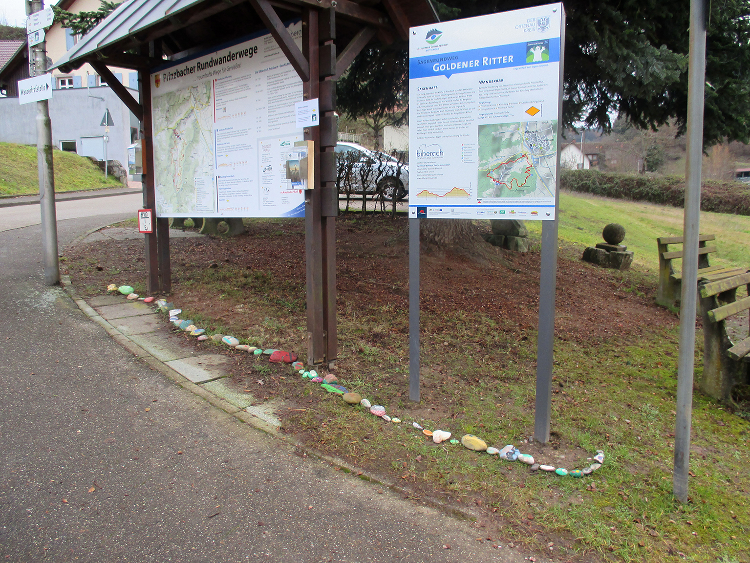 Viele Steine mit verschiedenen Bildern, Motiven, Texten oder auch Namen zieren den Platz beim Christbaum unter den Hinweisschilder für die Prinzbacher Rundwege und den Sagenweg »Goldener Ritter«. Mal schauen ob sich die Schlange in der Adventszeit und über die Weihnachtsfeiertage weiterbewegt und noch weiterwächst.