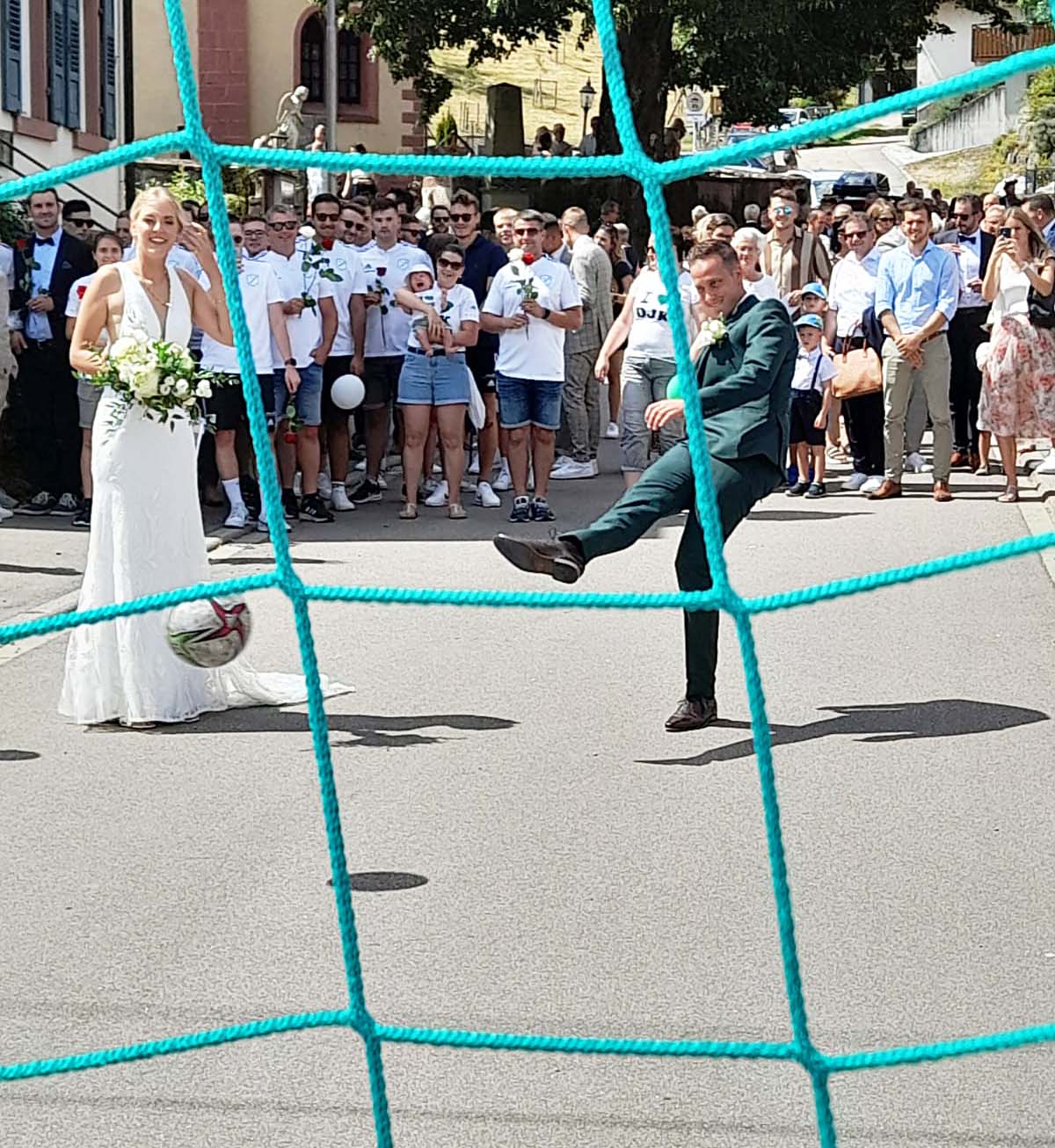 Sowohl die Braut als auch der Bräutigam durften anschließend versuchen das runde Leder ins Tor zu schießen. DJK-Vorstand Markus Schäfer überbrachte dem Brautpaar die Glückwünsche und Geschenke des Vereins.
