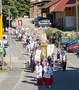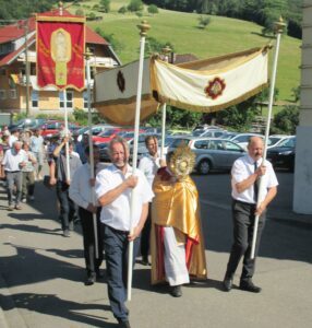 Im Anschluss an den Gottesdienst machte sich die Gemeinde auf zur Prozession, eine positive Demonstration – so Pater Kames – durch die Prinzbacher Straßen. Von der Kirche aus ginge es, angeführt von Kreuz und Fahne, gefolgt vom Musikverein Prinzbach-Schönberg, dem Kirchenchor, den Kommunionkinder mit ihren Begleiterinnen, den Ministranten, dem Himmel mit dem Allerheiligsten und Pater Kames, gefolgt von den Gläubigen zum Brunnenhof am Ortseingang von Prinzbach zum ersten Altar, für den sich die Familie Vitt verantwortlich zeigte. Nach der Lesung wurde von den Kommunionkindern das Lied »Öffne unsere Herzen« und die Fürbitten vorgetragen. Nach dem Segen durch Pater Kames ging es über die Bergwerksstrasse zurück zur Kirche. Auf dem Vorplatz der Kirche war der zweite Altar in Verantwortung der DJK Prinzbach aufgebaut. Nach der Lesung bei den Fürbitten wurde mit dem Antwortruf »Was uns auf dem Herzen liegt, tragen wir dir Gott vor« um Unterstützung erbeten.