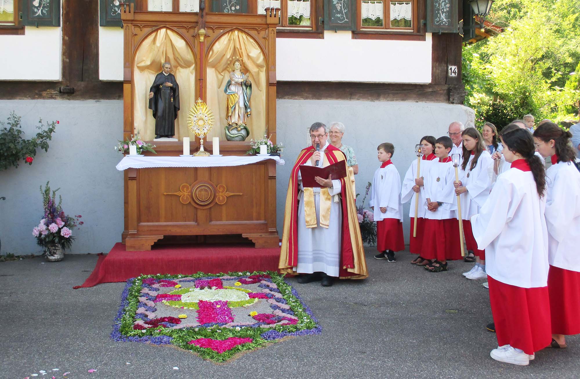 Am vergangenen Sonntag feierte die Pfarrgemeinde St. Mauritius Prinzbach das Hochfest Fronleichnam. Durch den Wegzug der Kapuziner kam es, dass Pater Günther Kames aus Wolfach diesen Festgottesdienst leiten durfte. Er begrüßte alle anwesenden Kirchenbesucher, besonders aber die Kommunionkinder, welche zusammen mit ihren Eltern einen Blumenteppich in der Kirche am Alter gelegt hatten. Er trug das Motto »Jesus im Herzen tragen«. In der Festpredigt verdeutlichte Kames noch mal die bleibende Gegenwart und das Öffnen der Herzen der Gläubigen für Jesus zur Aufnahme von Sonne, Licht und Kraft.