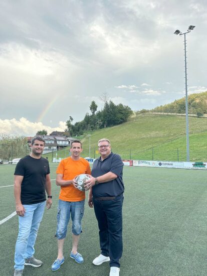 Volker Kirn von der Firma Lumosa (rechts) übergab einen Spielball an DJK-Vorstandsvorsitzenden Marcus Beschnidt (Mitte). Ein besonderes Dankeschön galt auch Frank Becherer (links), der die Aufrüstung der Platzbeleuchtung maßgeblich mitverantwortet hat. Foto: Matilda Schmidt