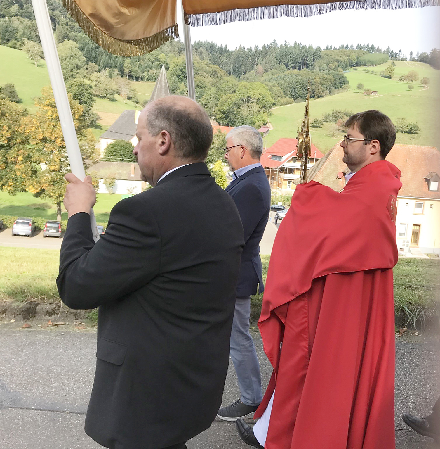 Nach der Eucharistiefeier machte man sich bei strahlendem Sonnschein auf zur Prozession durch den Ort. Angeführt von Kreuz und Fahnen, dem Musikverein, dem Kirchenchor, den Kommunionkinder sowie den Ministranten folgte der Himmel mit der Monstranz und dem Allerheiligsten, getragen von Pater Christoph. Ihm folgten die restlichen Gläubigen durch das Dörfle und die Bergwerksstraße zurück zur Kirche.
