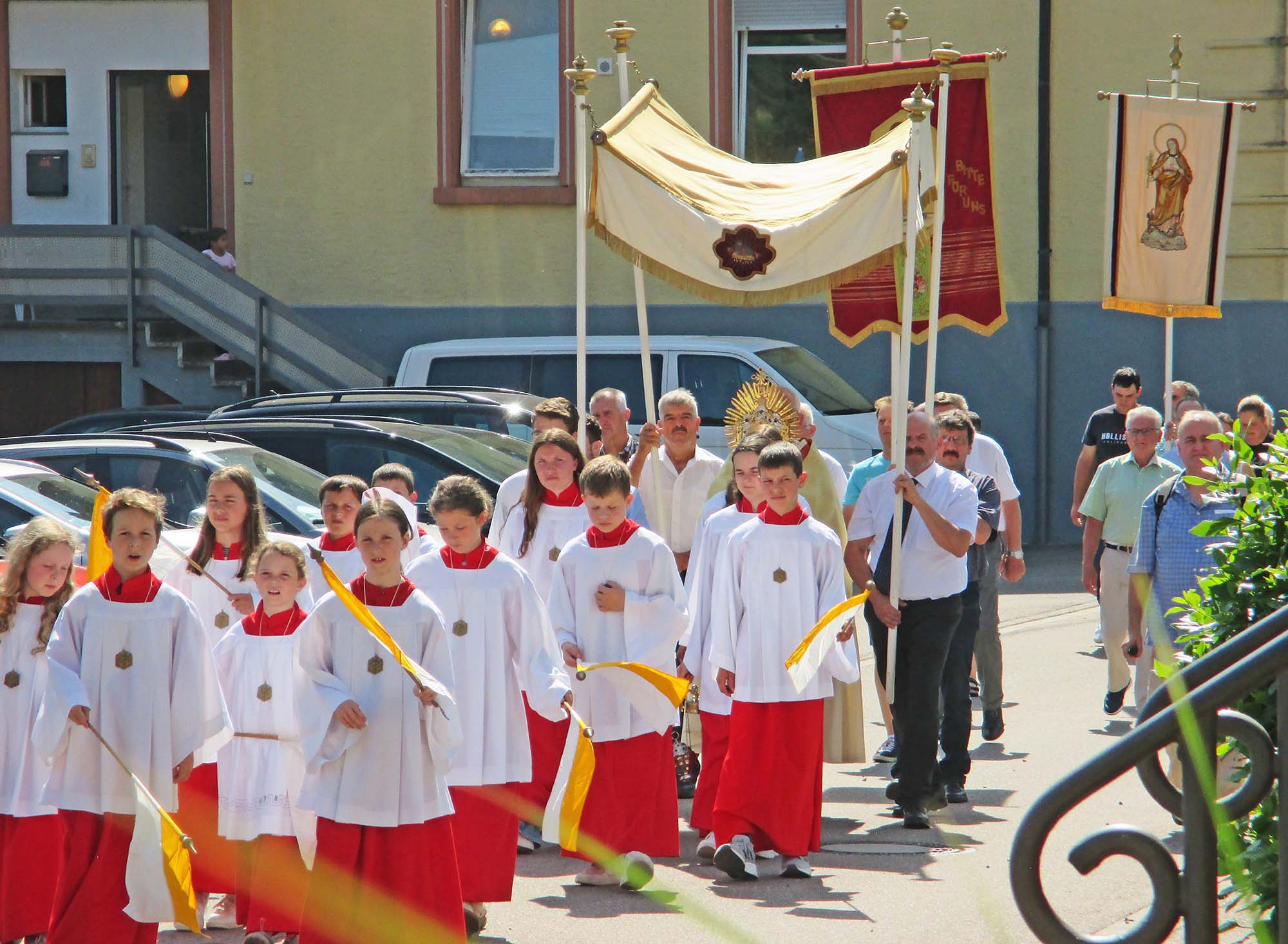 Im Anschluss an die Messfeier setzte sich der Prozessionszug trotz hochsommerlicher Temperaturen als öffentliches Zeichen des Glaubens in Bewegung. Angeführt von Kreuz und Fahnen folgten der Musikverein Prinzbach-Schönberg, der Kirchenchor, die Kommunionkinder und die Ministranten. Unter dem „Himmel“ trug Pater Irenäus das Allerheiligste, gefolgt von zahlreichen Gläubigen. Die Prozession führte durch das Dörfle zum Brunnenhof der Familie Vitt. Dort war eine Station vorbereitet. Nach einem Abschnitt aus dem Matthäusevangelium und den Fürbitten dankte Pater Irenäus der Familie Vitt für deren Engagement und den liebevoll gestalteten Andachtsplatz. Nach dem sakramentalen Segen ging es weiter über die Bergwerkstraße zurück zur Kirche.