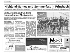 Biberach-Prinzbach | 15.08.2025 Highland-Games und Sommerfest in Prinzbach Foto: Foto: Archivfotos: Hanspeter Schwendemann von Schwarzwälder PostVom 16. bis 18. August 2025 wird zünftig gefeiert – Prinzbach-Highlanders und Musikverein Prinzbach-Schönberg laden ein Das könnte Sie auch interessieren:Foto: Hanspeter Schwendemann11-Meter-Maien für Ortsvorsteherin Matilda SchmidtFoto: Inka Kleinke-BialyDas Personalkarussell hat sich gedrehtFoto: Inka Kleinke-BialyKilwi-Fleiß der Musiker zahlt sich aus
