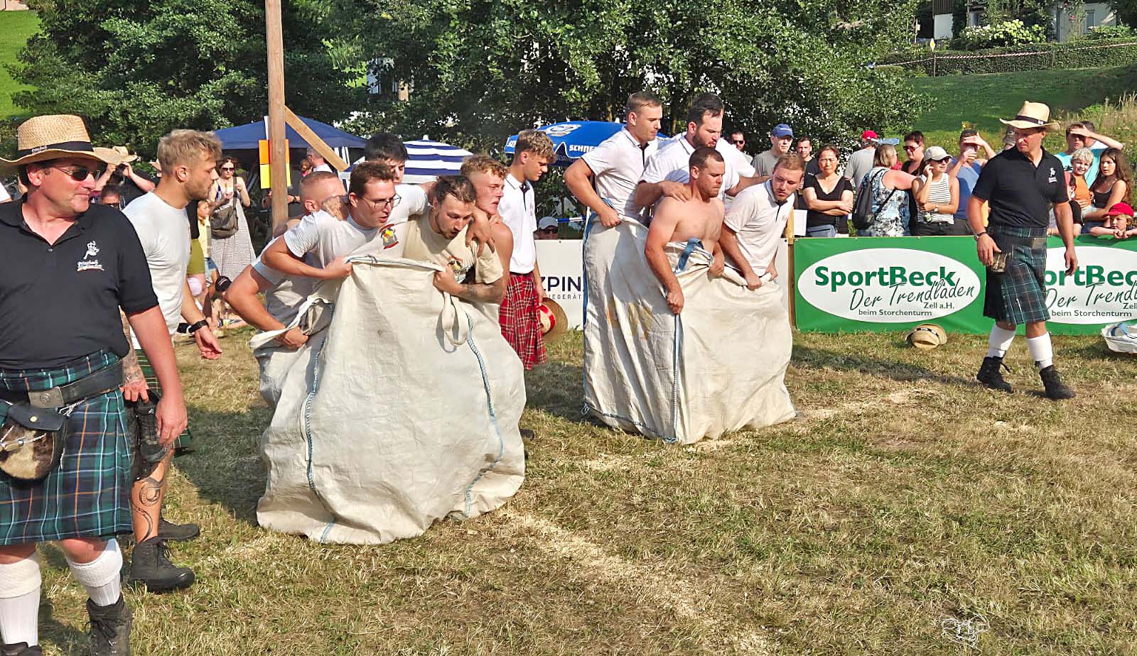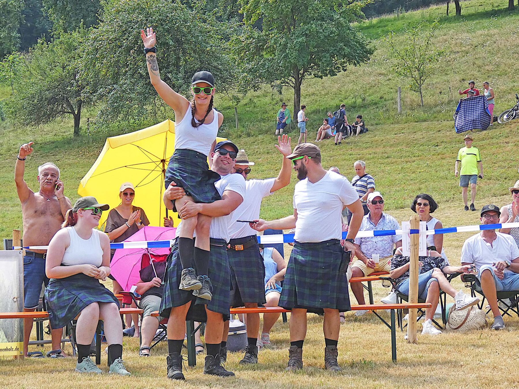 Überdies sorgten sie für zwei weitere Überraschungen. Zum ersten betraf das die Technik beim Wheelbarrow-Rennen. Denn die als Karre fungierende junge Frau war nicht nur ein Leichtgewicht, sondern hatte bärenstarke – wenn nicht gar eiserne – Bein- und Fußmuskeln: Die umklammerten den Rumpf ihres sie schiebenden Kollegen mit solcher Kraft, dass dieser sie auf der Schlussgeraden nicht halten musste und daher freihändig rennend das Ziel ansteuerte. Ein Bild für die Götter, ob nun schottisch oder nicht.