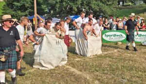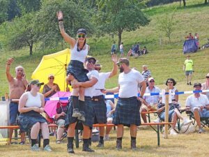 Vielleicht war es Lugh, ein Gott aus der schottischen beziehungsweise keltischen Mythologie, der am vergangenen Samstagnachmittag genau zugehört hatte und sich dachte: „Euer Wunsch sei mir Befehl.“ Und vielleicht hatte er schon gleich beim ersten Game seine Hand im Spiel, dem „driving the scottish wheelbarrow“. Um ein „Schubkarrenrennen“ ging es hier. Nicht wie in Kinderzeiten auf Händen, sondern auf einem einzelnen Rad mit seitlichen Haltegriffen – und auch nicht geradeaus, sondern über ein über ein Stück Baumstamm gelegtes Brett, unter einer niedrigen Planke hindurch, einen Slalomparcour entlang und wieder zurück.
