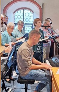 Pfarrer Stern leitete den Gottesdienst, der musikalisch von der Pop-Messe „Miss 3 You(th)“ des Komponisten Tjark Baumann geprägt war. Unter der Leitung von Adrian Sieferle brachte ein Projektchor zusammen mit Musikern frische Rhythmen und eingängige Melodien in die Liturgie. Ein Klang, der viele Gottesdienstbesucher bewegte.