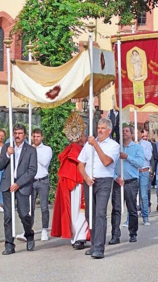 Nach dem Gottesdienst zog die Gemeinde in einer feierlichen Prozession durch die Straßen von Prinzbach. Begleitet wurden die Gläubigen vom Musikverein Prinzbach-Schönberg, der mit festlichen Klängen den Umzug umrahmte.