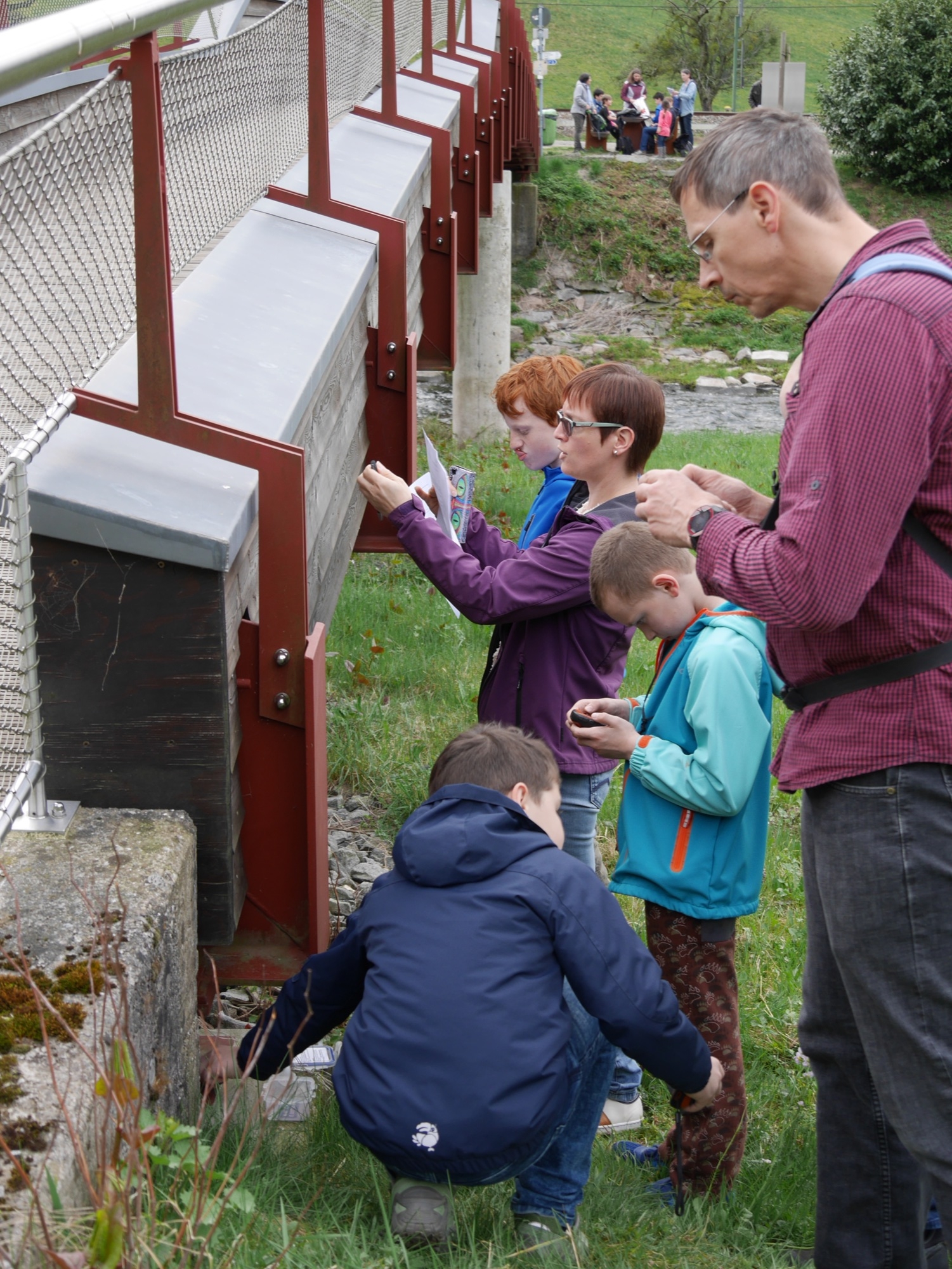 Foto: Schwarzwaldverein BiberachMittags um zwei machten sich die Wanderer mit der Bahn auf nach Halbmeil. Beim Gasthaus Löwen fand sich die erste Tafel des Flößerpfads mit Informationen zum »Sägen, Bretterflößen und Rebstecken«. Nachdem jedes der zehn Kinder mit einem GPS-Gerät ausgestattet und dieses mit den Geo-Koordinaten bestückt war, ging es auch schon los, den ersten Cache zu finden. An der Kinzig entlang konnte die Gruppe bei frühlingshaften Temperaturen die aufblühende Natur genießen. Bei einer Rast am Fluss kam eine Schafherde vorbei, was den Kindern einen zusätzlichen Spaß bereitete.