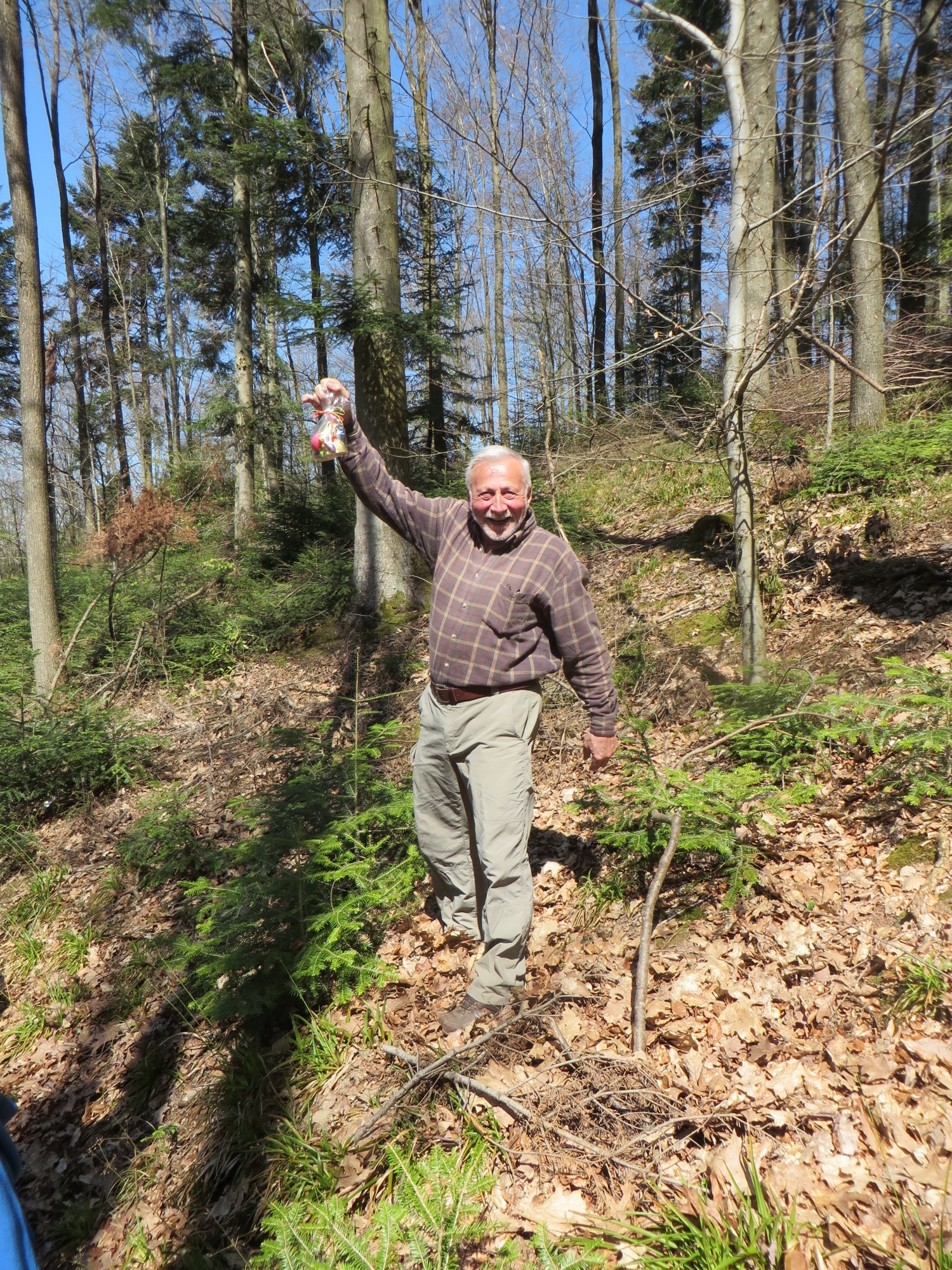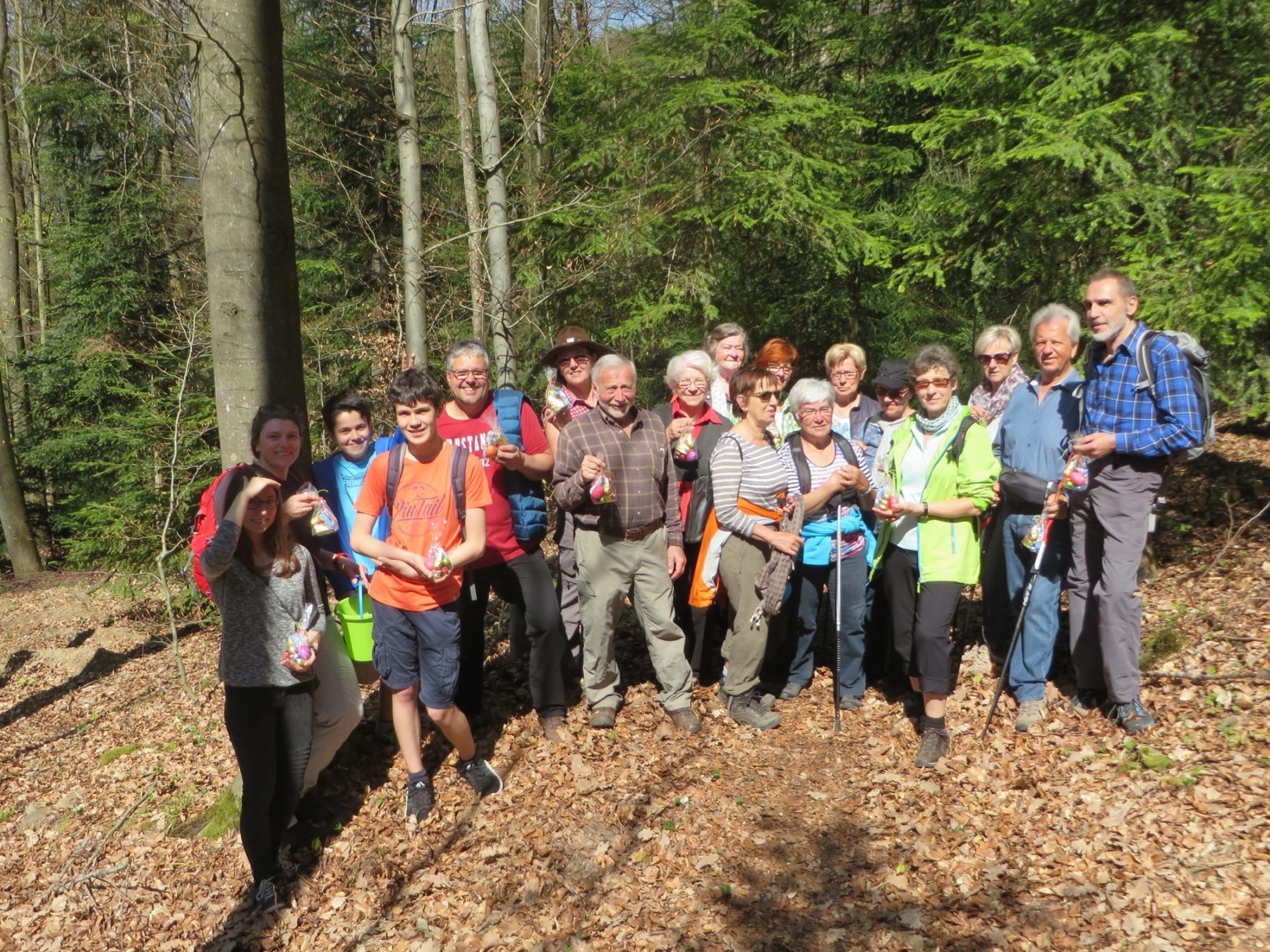 Vom Bahnhof ging es zum Rebeckpavillon mit Sicht auf Biberach, Emmersbachtal und Prinzbach mit der Burgruine Hohengeroldseck im Hintergrund. Über das August-Lehmann-Pavillon ging es weiter zum Rebeck. Hier gab es die erste Osterüberraschung. Für alle Mitwanderer, darunter auch drei Jugendliche, hatte der Osterhase ein Nest mit Süßigkeiten im Wald versteckt.