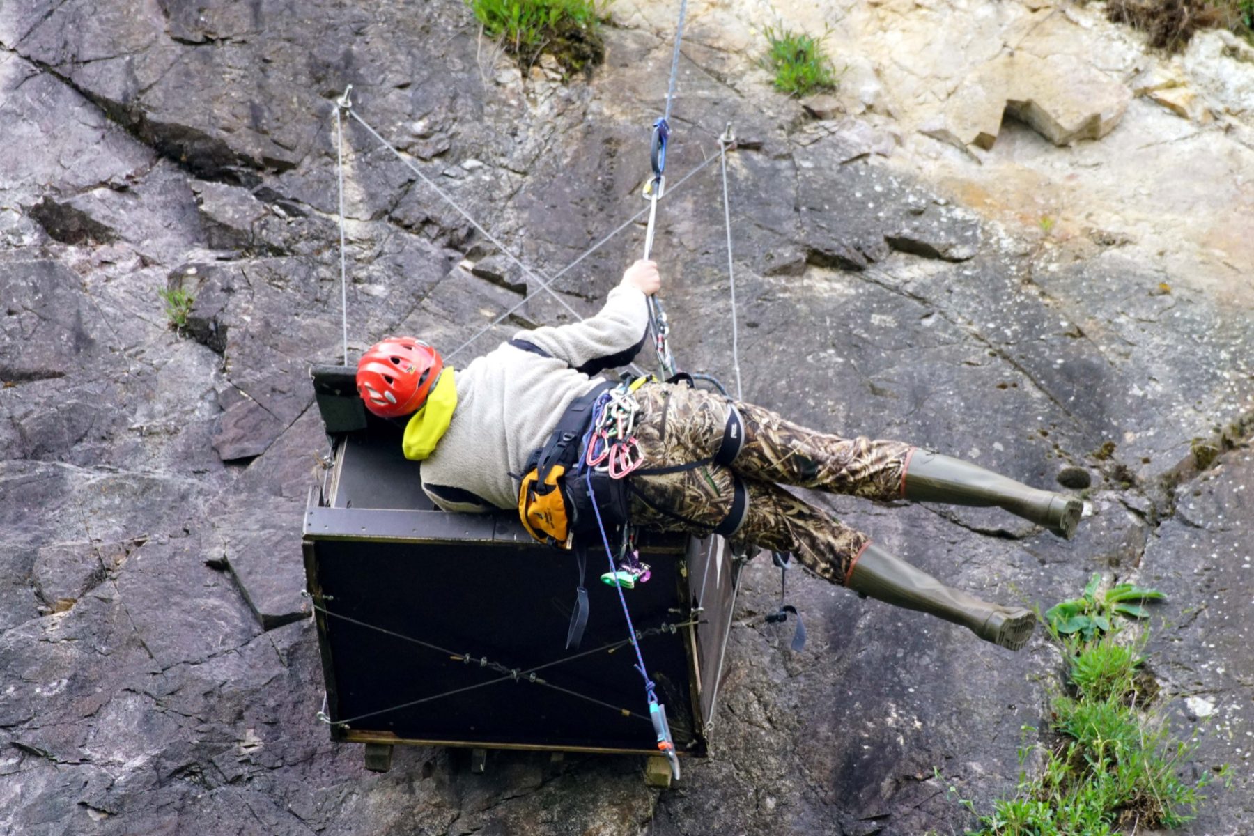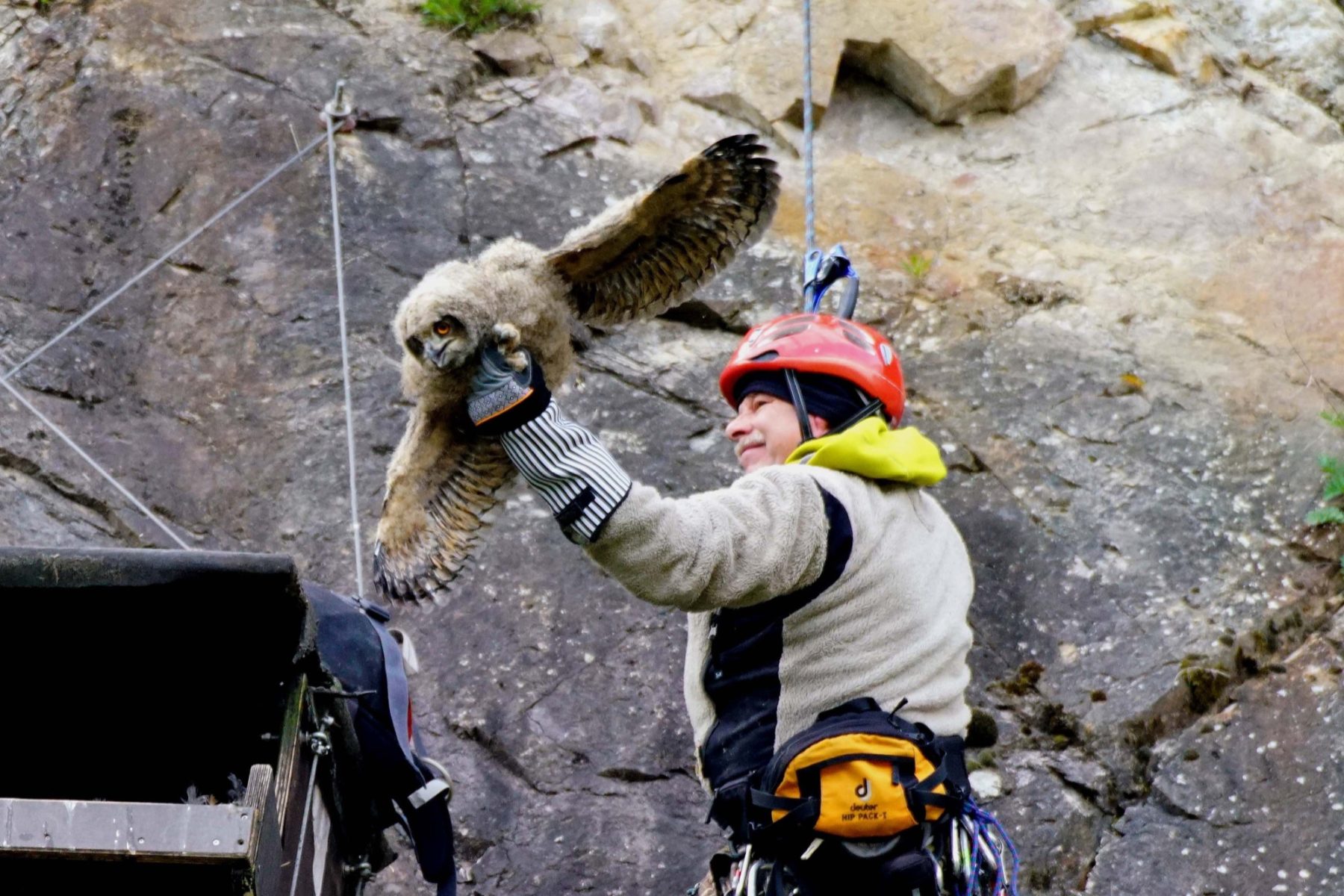 Für diese Arbeit war ein Alpinist gefragt. Jürgen Bergmann aus Berghaupten war für diese schwierige Aufgabe bestens geeignet. Er ist leidenschaftlicher und erfahrener Bergsteiger. Außerdem ist er ein bekannter Naturfilmer, der zusammen mit seiner Frau Bergit schon viele Preise abgeräumt hat. Sie sicherte ihren Mann bei der schwierigen Aufgabe.
