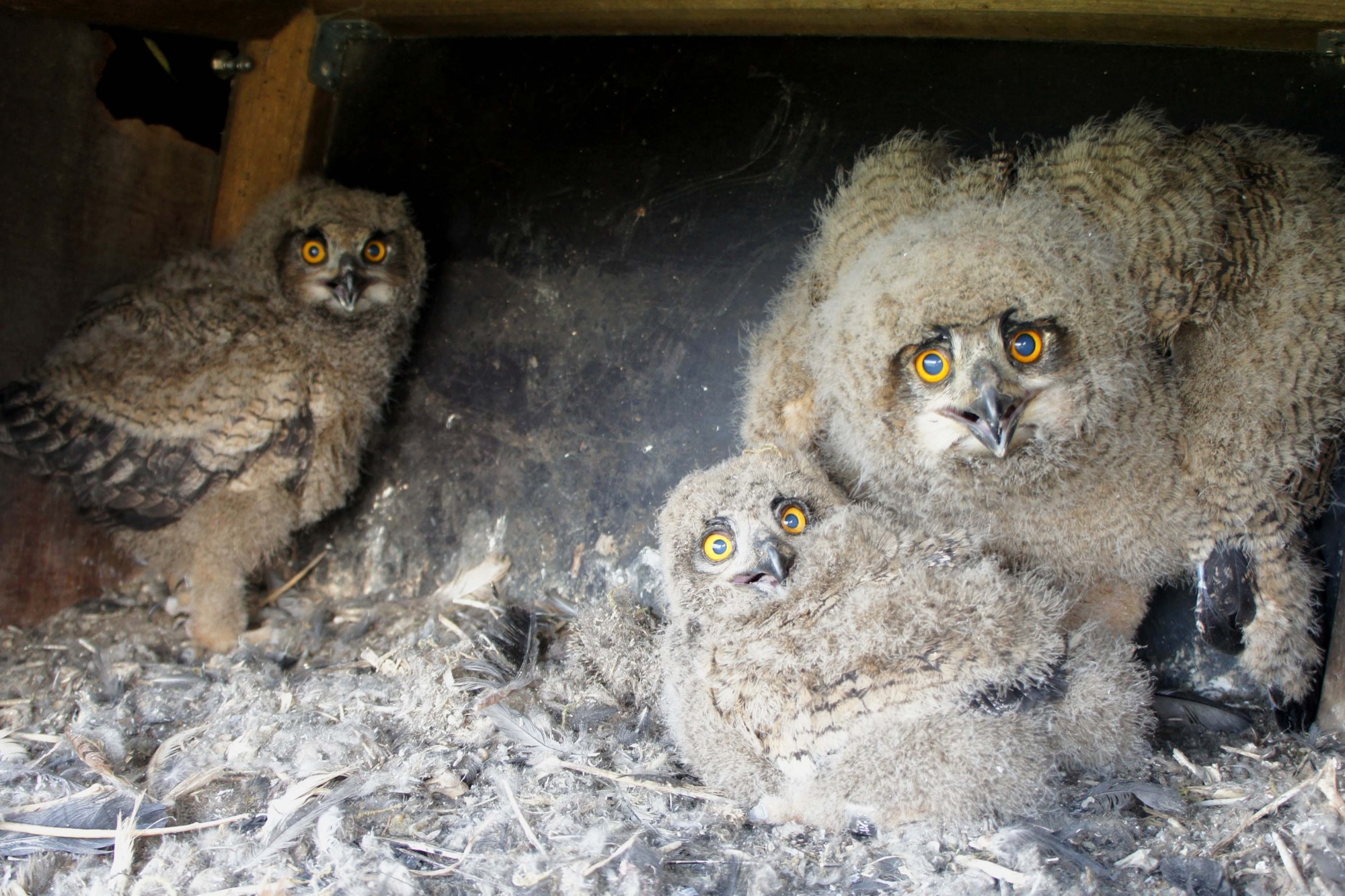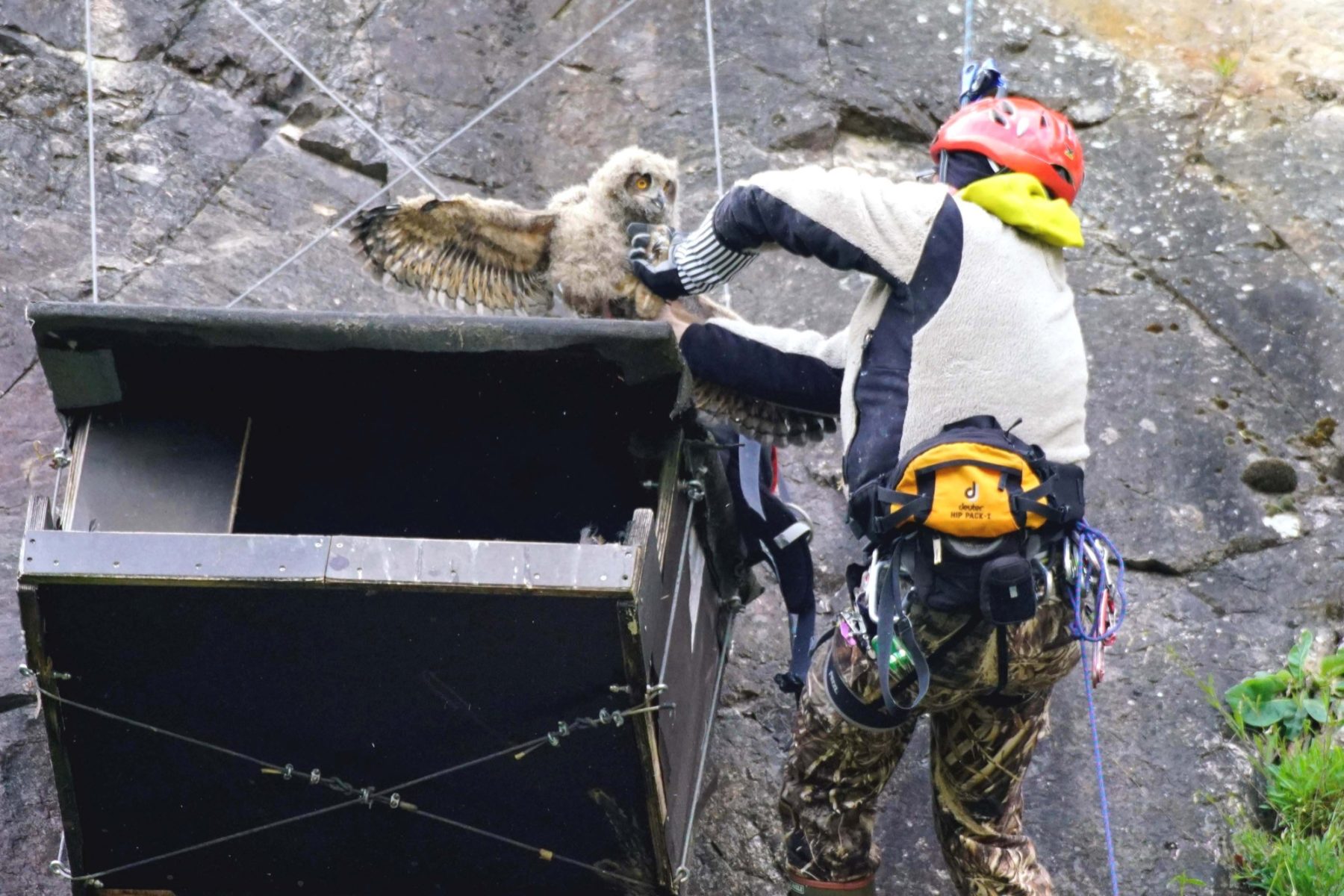 Foto: Helmut KrannichAm vergangenen Freitag wurden in Biberach an der Felswand mit Nisthilfe drei junge Uhus beringt. Ein Männchen und zwei Weibchen waren im Nistkasten, wobei eines der Weibchen und das Männchen schon sehr weit entwickelt waren und sich kräftig wehrten. Das »Nesthäkchen« war deutlich kleiner.