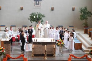 Foto: Oliver und Tanja WernertKooperator Rainer Warneck machte in seinem Predigtgespräch mit den Kindern in mehreren Beispielen deutlich, wie Jesus eine feste Verbindung mit den Kindern eingehen will. Durch den Empfang des Leibes Christi wurden auch die Kommunionkinder gestärkt, zu anderen Menschen – bildlich gesprochen – »Brücken zu bauen«.