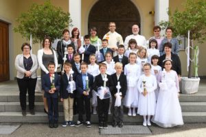 Im Mittelpunkt der Dankandacht am Nachmittag stand der Dank an Gott für diesen schönen Tag und an die Menschen, die die Kinder in der Vorbereitung auf die Erstkommunion begleitet haben. Neben der Hauptverantwortlichen Barbara Fritsch waren dies die Gruppenbegleiterinnen Sandra Bachlmayr, Silvia Buchholz, Judith Busse, Sabine Callierotti, Stefanie Dietze, Claudia Große, Nicole Hug und Nathalie Moriz.