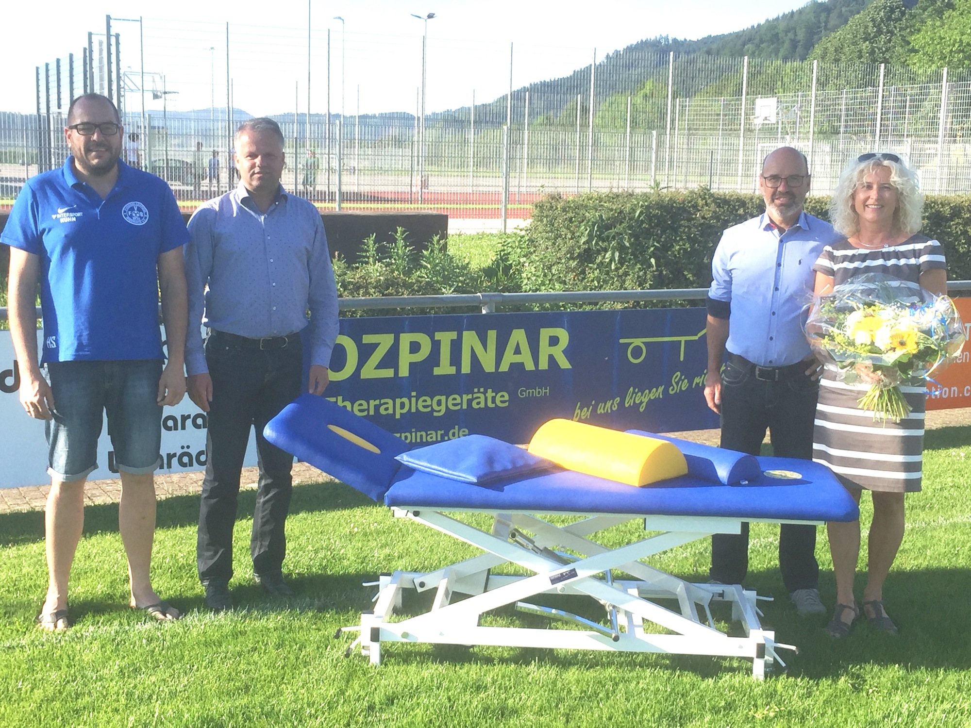 Über eine nagelneue Therapieliege, gepolstert in den Vereinsfarben Blau und Gelb mit aufgesticktem Vereinslogo, dürfen sich die Fußballer des FV Biberach freuen. Seit Jahren unterstützt die Firma Özpinar den FVB in Form von Anzeigen im Stadionheft, Bandenwerbung und als Sponsor auf der Trainingskleidung. Mit der neuen Liege besteht nun auch die Möglichkeit, die momentan nicht besonders erfolgsverwöhnten Spieler des FVB physiotherapeutisch perfekt auf die anstehenden Aufgaben vorzubereiten. Als kleiner Dank wurde Jutta Gissler, Geschäftsführerin der Firma »Özpinar«, ein Blumenstrauß in den Vereinsfarben übergeben.