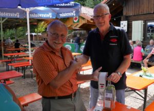 Mit Erstaunen wurde das Bienenwegle beschritten und ein Blick in einen Bienenstock gewagt. Mit Picknick und Wasserrutschen wurde der Besuch abgeschlossen. Dann ging es weiter nach Schapbach, um der Ortsgruppe zum 75-jährigen Jubiläum zu gratulieren. Der Vorstand Manfred Krauss nahm gerne den Wimpel und eine Flasche Hochprozentiges entgegen, welches gemeinsam gleich an Ort und Stelle verkostet wurde.