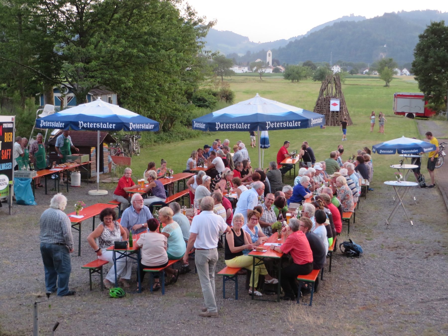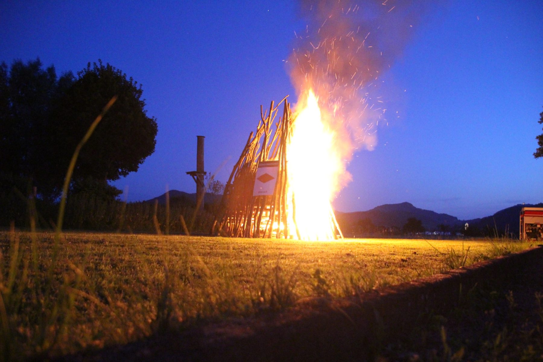 Am Abend wurden die Gäste mit Grillwürsten und kühlen Getränken bewirtet. Mit viel Applaus für die Live-Musik wurde der Alleinunterhalter Jochen Singler von den etwa 150 Besuchern bedacht. Gegen 22.15 Uhr war es dann soweit, das Johannisfeuer wurde von Hans Gißler, Hans Höhn und Hans Cunico von der Feuerwehr Biberach entfacht. Diese standen auch mit dem Löschfahrzeug bereit, um bei einem Ausweiten des Feuers sofort eingreifen zu können. Kurze Zeit später stand die ganze Pyramide in Flammen. Mit Ahs, Ohs und viel Beifall der Zuschauer schlugen die Flammen hoch in den sternenklaren Nacht­himmel.