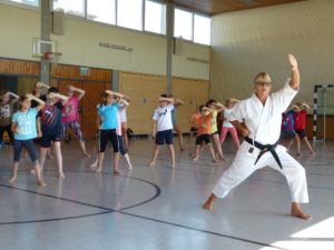 Nach dem Aufwärmen geht es für Klaudia Isenmanns Schützlinge gleich mit einer ersten Karate-Übung los: dem geraden Fußtritt mit dem hinteren Bein. Dazu ruft die