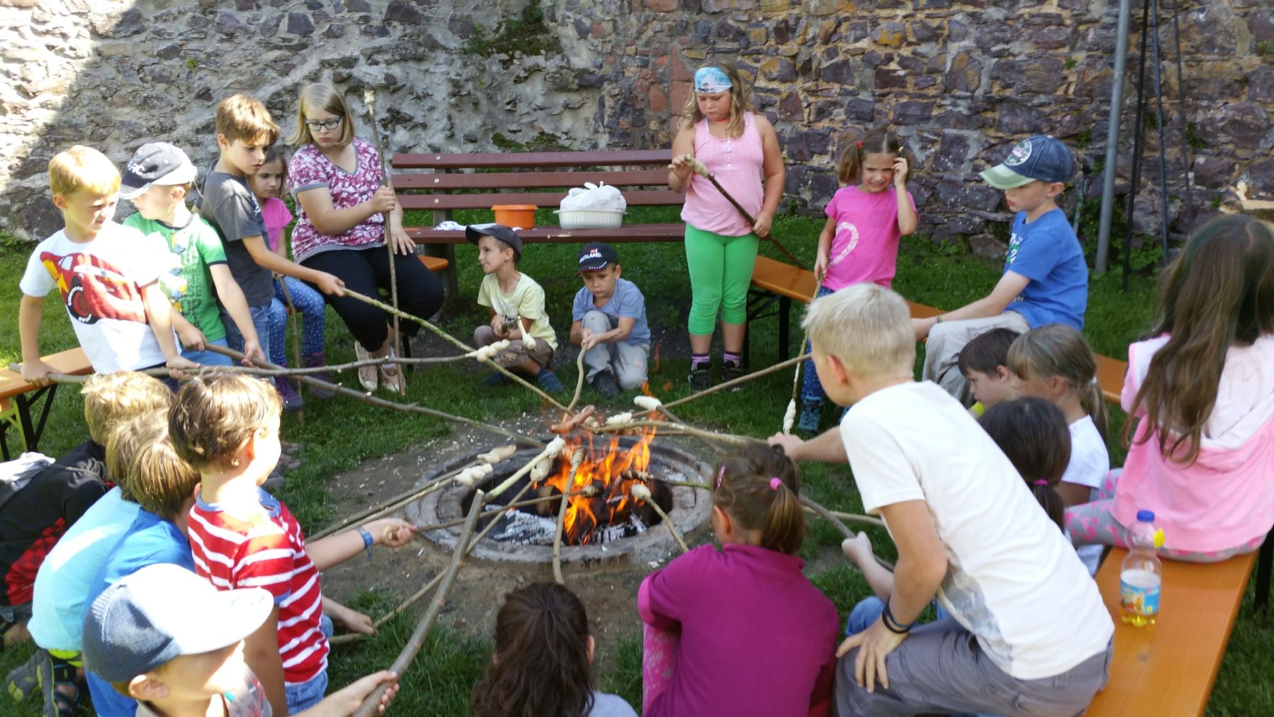 Anschließend durften die Kinder den Alltag der damaligen Bewohner nacherleben. Martina Ringwald sorgte dazu für das leibliche Wohl. Es wurden Wildkräuter für den Brotaufstrich gesammelt, aus Rahm wurde Butter geschlagen, Stockbrot am Lagerfreuer gebacken und Würstchen gegrillt.