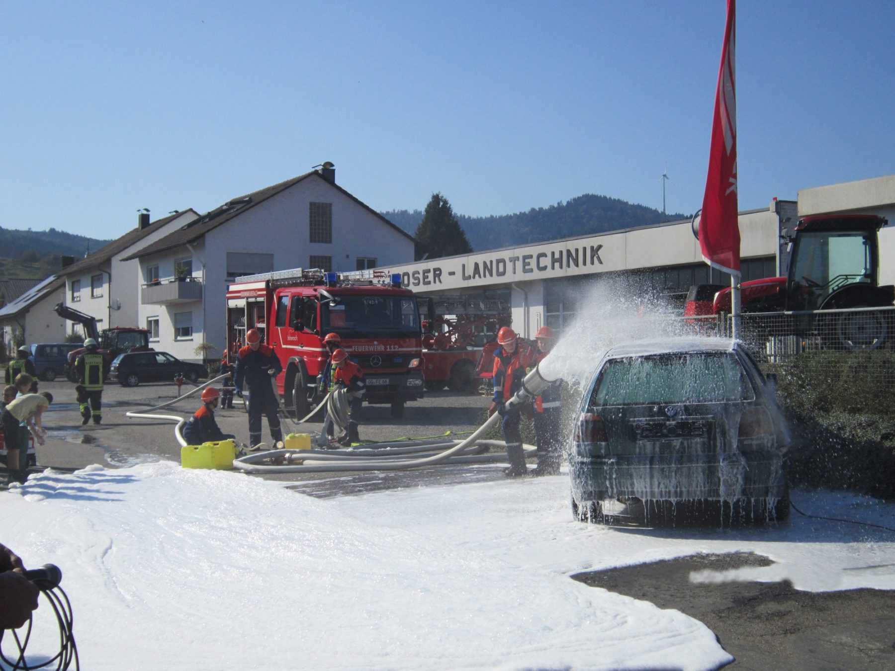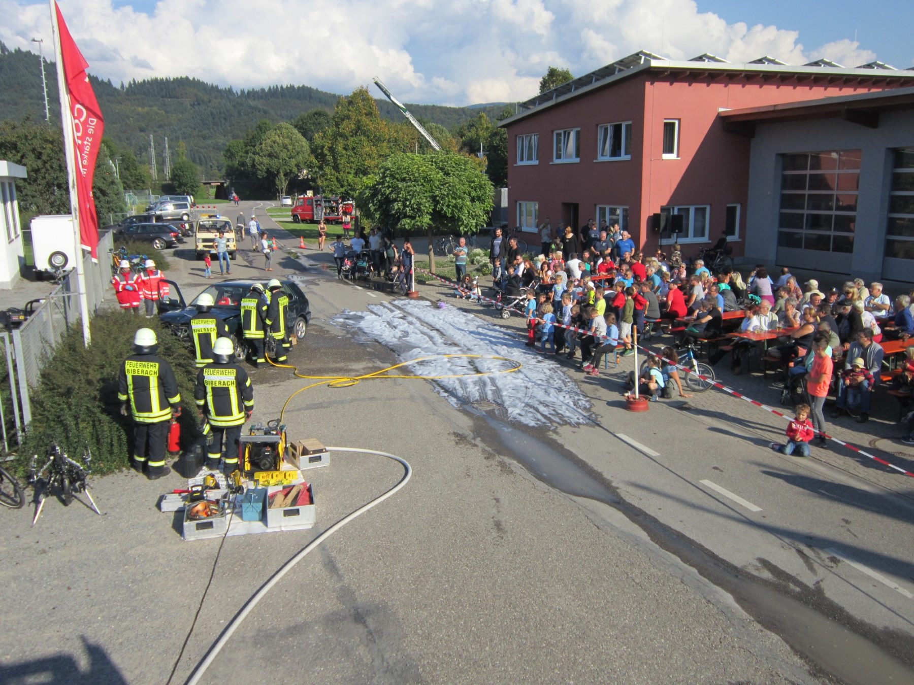 Anhand von drei Vorführungen brachte die Feuerwehr Biberach den Zuschauern näher, wie bei einem Einsatz vorgegangen wird und worauf zu achten ist. Angefangen mit einem Wohnungsbrand bis hin zu einem Verkehrsunfall mit eingeklemmter Person wurde einiges geboten. Auch die Jugendfeuerwehr bewies ihr Können beim Löschen eines Fahrzeugbrandes mit Schaum.