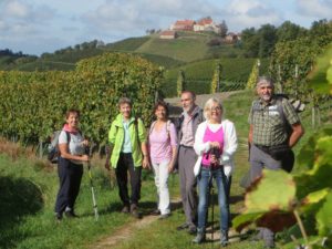 St. Anton. Sie wurde in ihrer jahrhundertelangen Geschichte mehrmals beschädigt oder zerstört. 1790 wurde die letzte Messe gehalten, danach zerfiel das Gebäude. Saniert wurde die Kapellenruine erst 1988 – 1995. Durch Wald und Reben erreichten die Wanderer über die Maiglöckchenhütte das Wahrzeichen, das Schloss Staufenberg. Von der Aussichtsterrasse hatte man einen herrlichen Blick auf Durbach, die Vorbergzone des Schwarzwaldes, das Rheintal und im Hintergrund Straßburg mit seinem Münster. Vorbei an der Brandstetter Kapelle erreichte die Gruppe den Hummelswälder Hof zur Mittagsrast. Über Kasselberg, Immersbach, Halbgütle, durch Durbach mit seinen schmucken Fachwerkhäusern hindurch ging es zurück zum Ausgangspunkt. Die Tour war eine landschaftliche und kulinarische Entdeckungsreise in den Reben rund um Durbach an der badischen Weinstraße.
