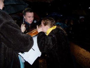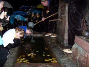 Große Freude herrschte bei den Bibern, die mit Karolin Riehle und Tom Schmieder zwei neue Hästräger in ihren Reihen aufnehmen konnten. Nach traditionellem Durchbeißen eines mächtigen (Laugen)-Baumstammes folgte die symbolische Taufe mit der Schöpfkelle am Narrenbrunnen. Hier sparte Ralf Volk, der zum ersten Mal als Täufer fungierte, nicht mit dem kalten Nass. Obwohl auch der Himmel alle Schleusen geöffnet hatte und reichlich Wasser zur Taufe beisteuerte. »Der Biber isch ein Wassertier – darum sind mir au hier« ließ sich Oberbiber Andreas Schmider von dem Schmuddelwetter jedoch nicht beeindrucken.