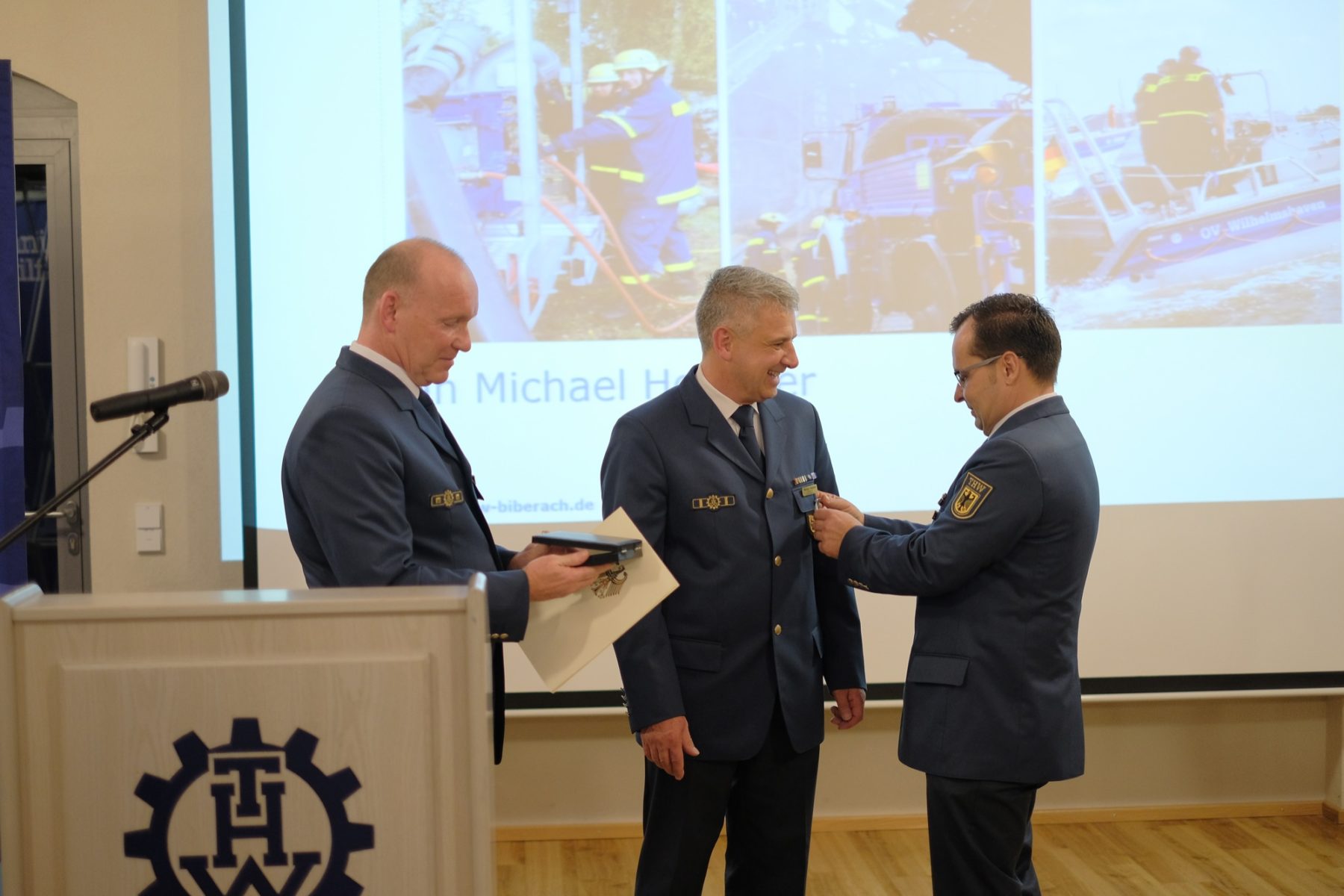 »Werte kann man nicht lehren, sondern nur vorleben«, fasste der THW-Landesbeauftragte Dietmar Löffler mit einem Zitat von Viktor Frankel in seiner Laudatio kurz und knapp das zusammen, was Michael Holderers Engagement im THW so wertvoll macht. Seit seinem Dienstantritt habe er, ganz gleich in welcher Funktion, deutliche und beachtenswerte Spuren hinterlassen, die innerhalb des THW fortwährend positiv zur Sprache kämen. Kompetenz, Innovation, Zielstrebigkeit und sein Verantwortungsbewusstsein machten Michael Holderer zu einer allseits geschätzten Persönlichkeit und Führungskraft. Durch die Verleihung des THW-Ehrenzeichens in Bronze werde dieses außergewöhnliche Engagement und die überdurchschnittliche Leistung gewürdigt.