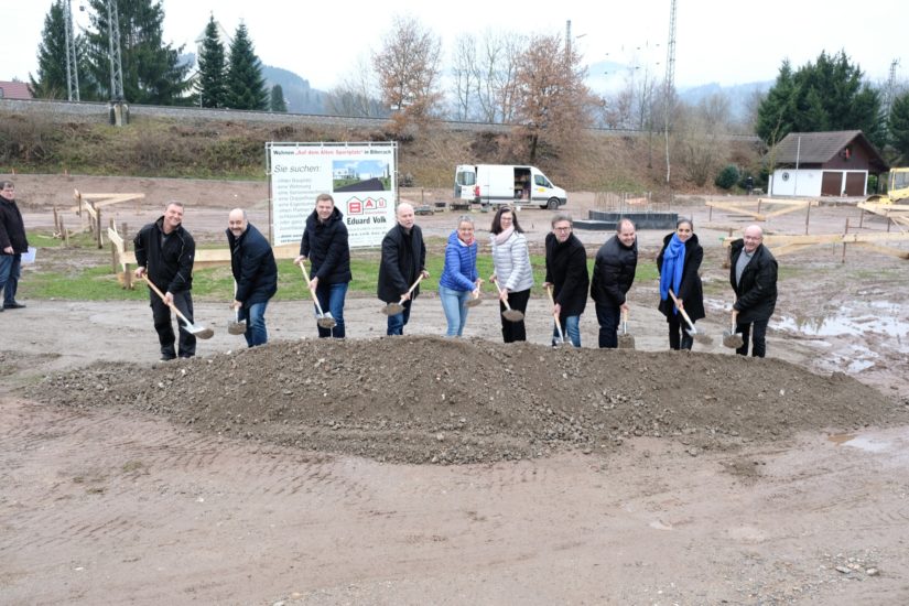 Auch wenn sich beim symbolischen Spatenstich am Nikolaustag in Summe weit weniger als eine Baggerschaufel voll Erde bewegte und bestimmt noch viele Kubikmeter Boden bearbeitet werden müssen, waren alle guter Dinge. Investor Eduard Volk freute sich, dass sich die lange Phase der Vorbereitungen zu Ende neigt, in der »die Planer viel Papier verwenden mussten«. Er berichtete zu diesem frühen Zeitpunkt bereits über zahlreiche Nachfragen zum Projekt. Bürgermeisterin Daniela Paletta hatte bei nasskalter Witterung ebenfalls ein Lächeln im Gesicht. Ein schönes Nikolausgeschenk sei der Spatenstich für dieses Leuchtturmprojekt, bei dem auch der Verein »Hilfe von Haus zu Haus« endlich eine dauerhafte Bleibe gefunden habe. Architekt Karl Ringwald sah in der Arbeit seines Büros an dem Projekt gleichermaßen eine große Ehre wie eine große Herausforderung. Auch die zukünftigen Nutzer des Gebäudes waren eingeladen gewesen, um den Abschluss der vorbereitenden Maßnahmen sowie den baldigen Baubeginn würdig zu begehen.