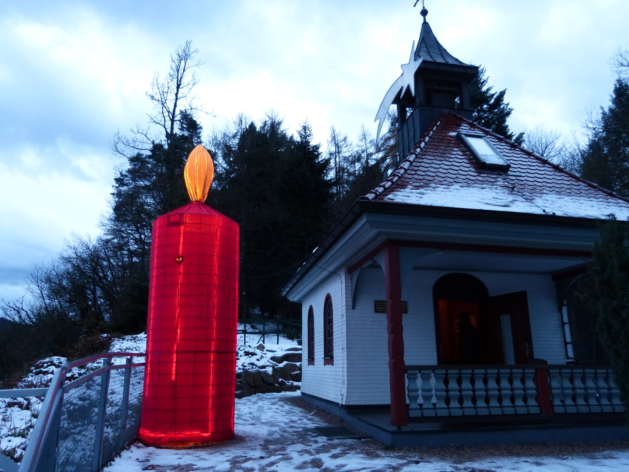Foto: Inka Kleinke-BialyEine dieser mithilfe von Drahtgestellen stilisierten Kerzen ist von weithin sichtbar – mit ihrem leuchtenden Rot grüßt sie tagsüber vom Standort der Kapelle auf dem Sturmbühl hinunter ins Tal. Und mit der einsetzenden Abenddämmerung setzt ihr warmes Licht einen Leuchtpunkt in die Dunkelheit, dank einer eigens verlegten Stromleitung.
