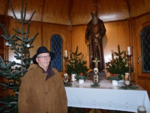 Mindestens einmal in der Woche kommt Alfons Büdel hier herauf, um nach dem Rechten in- und außerhalb der Kapelle zu schauen. Da er in der Nähe ein Wiesenstück gepachtet hat, erklärte er sich vor 32 Jahren bereit, die Patenschaft für das kleine Bauwerk zu übernehmen.