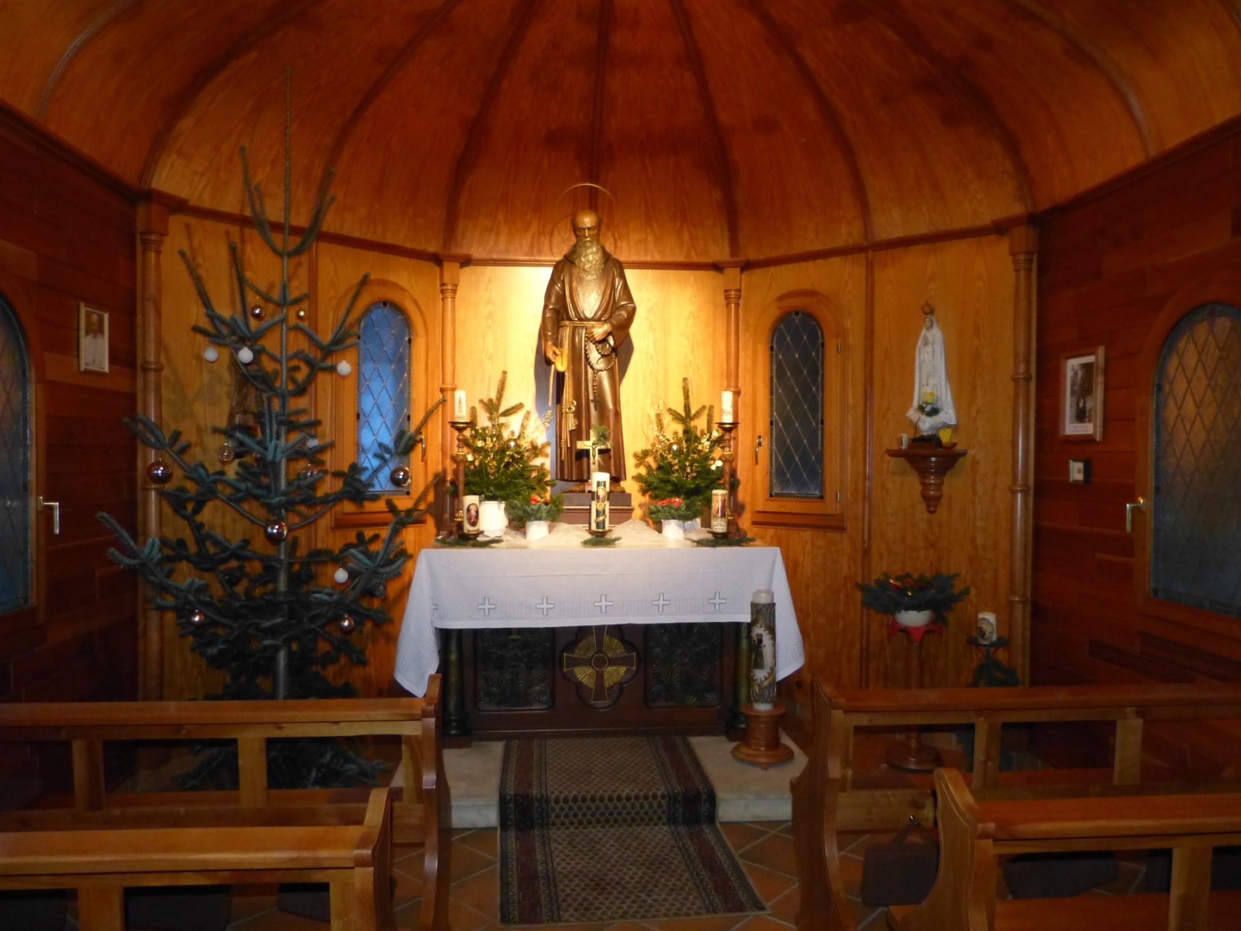Das hatte es mit seinem neuen Paten bestens getroffen. Denn der ist gelernter Schreiner. Nicht einmal eine Ahnung von Moder ist heutzutage zu riechen, obwohl das gesamte Innenleben der Kapelle aus Holz besteht. »Wir haben alles hinterlüftet, da kann nichts mehr passieren«, zeigt Alfons Büdel nicht ohne Stolz auf die Wandverkleidung aus Kirschbaumfurnier, das in mühevoller Kleinarbeit der Deckenrundung angepasst wurde und dessen warmer Ton dem Innenraum seine einzigartige Atmosphäre verleiht.