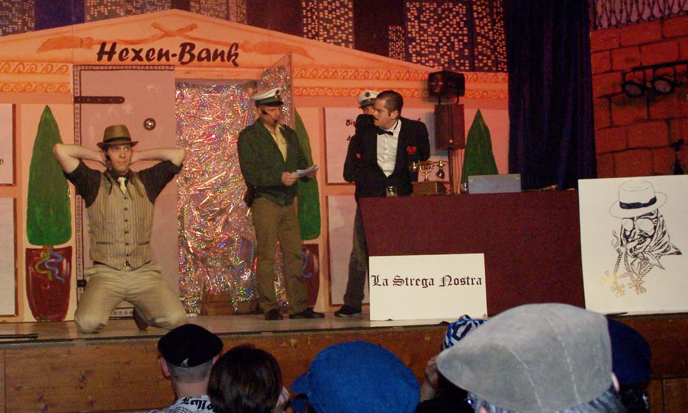 Beim »Verhör« kam ein wahrhaft greulicher Übeltäter in die Fänge der Ermittler. Ein Überläufer von den Hexen zu den Bibern! Nachdem auch eine Komplett-Rasur des bissfesten Wassergetiers die Hexe nicht wieder zum Vorschein brachte, ging es ab hinter schwedische Gardinen. Wie die Orgelpfeifen marschierten die Gebrüder »Dalton« mit ihrer kriminellen »Ma« in Biberach ein und versuchten den gigantischen Hexentresor zu knacken. Das einzige was sie jedoch zu Tage förderten waren Schnitzer: So hat doch die Evi Lehmann beim Ostermarkt mit großen Worten ihre Frisuren-Models angekündigt – diese standen jedoch noch vor verschlossener Tür und konnten nur hilflos auf Einlass warten.
