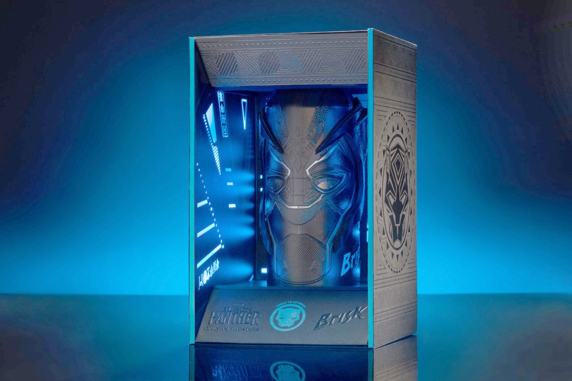 Wer das Vergnügen hat, die Verpackung zu sehen, wird diese Begeisterung sofort verstehen: Eine im 3D-Druck hochveredelte Dose der PepsiCo-Marke »Brisk« im Design des Filmheldens »Black Panther« wird auf einer kleinen »Bühne« mit ausklappbaren Seitenteilen im Look des Innenraums der Hightech-Tarnkappenschiffe aus dem Film inszeniert. Prägungen in allen Facetten, eine 20-sekündige Lichtchoreographie, raffinierte Klappmechanismen sorgen für den überraschenden Bühneneffekt, der sich nach dem Öffnen der ganz in schwarz gehaltenen Verpackung ergibt.