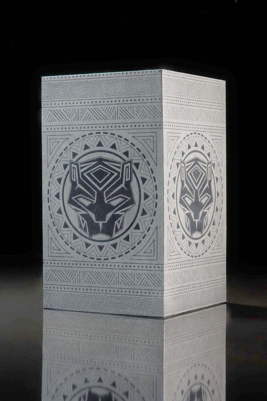 Optisch wie haptisch dem ursprünglichen Look des Filmschauplatzes »Wakanda« angepasst, wurde die Verpackung robust und wertig aus einer Festkartonage, hochveredelt mit 3D-UV-Lack auf Naturkarton, hergestellt. Die Verpackung ist in allen Details optisch wie funktional ein Genuss und natürlich mehr als ausgereift. Als Zugabe ist die Replik des Armbands mit den aus dem Film bekannten »Kimoyo-Perlen« passend in einer hochveredelten Festkartonage mit Lasercut-Schaumstoffeinlage verpackt.