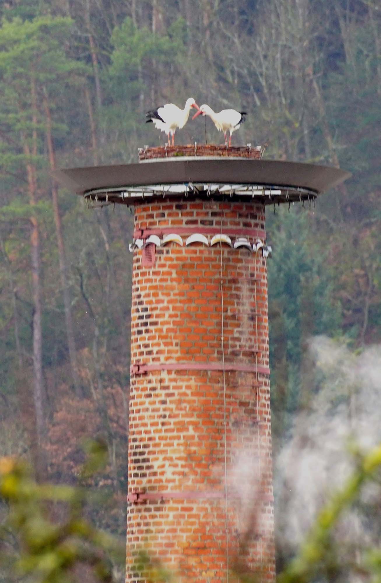 Vor ein paar Wochen kehrte »Daddy Otto« auf den Rietschekamin zurück. Wie letztes Jahr ließ sich kurze Zeit später ein Storch auf dem Kirchendach nieder und fing an ein Nest zu bauen. Vermutlich ist es wieder die Storchendame mit der Ringnummer AN305, da Störche absolut ortstreu sind. Daddy Otto ließ sich nicht lange bitten und half beim Nestbau, da seine angebetete »Gertraud« noch nicht aufgetaucht war. Das Nest auf dem Kirchendach entwickelte sich prächtig. Vor ein paar Tagen kam jedoch Gertraud ebenfalls zurück und Daddy Otto war an der neuen Storchendame nicht mehr interessiert. Sie versuchte noch ihn abzuwerben, was bei Gertraud nicht gut ankam. Sie attackierte ihre Konkurrentin und vertrieb sie. Dieses Spiel fand letztes Jahr genauso statt. Jetzt kommt die entscheidende Wendung im Vergleich zum letzten Jahr: Ein vierter Storch kam an und gesellte sich zu der Dame auf dem Kirchendach. Das Nest allerdings wurde wohl in der Nacht von Montag auf Dienstag vom Sturm vom Kirchendach geweht. Das neue Paar sammelte das Material und baut nun ein Nest auf einer Fichte direkt am Pfarrhaus bei der Kirche, der die Spitze fehlt. Im Moment haben wir also zwei Storchenpaare in der Ortsmitte. Wie lange das so bleibt, ist fraglich. Die Neuankömmlinge werden von Daddy Otto und Gertraud immer wieder attackiert, da sie ja direkte Nahrungskonkurrenten sind.