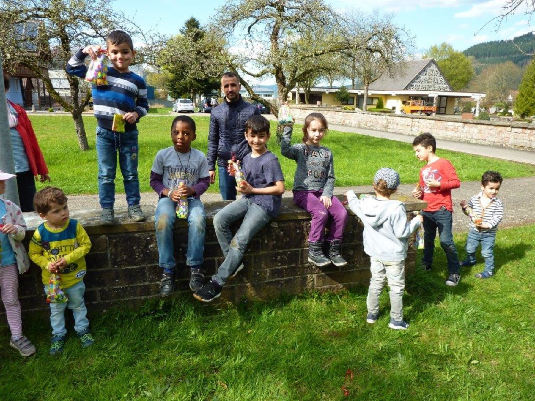 Ein Gruppenfoto war fast nicht möglich, da die Kleinen selbst wie Osterhasen über die Wiese hoppelten, um die Osternester zu finden.